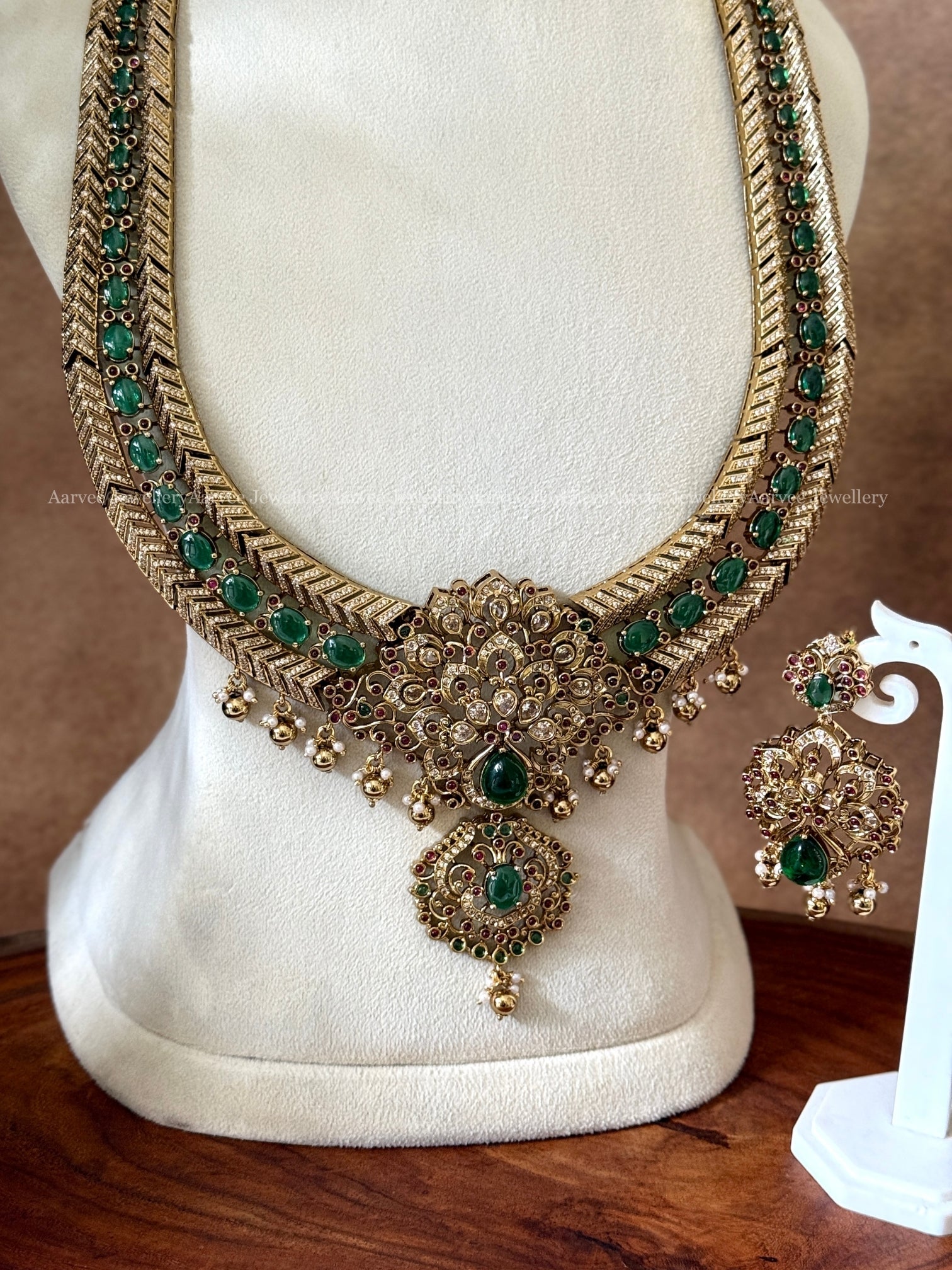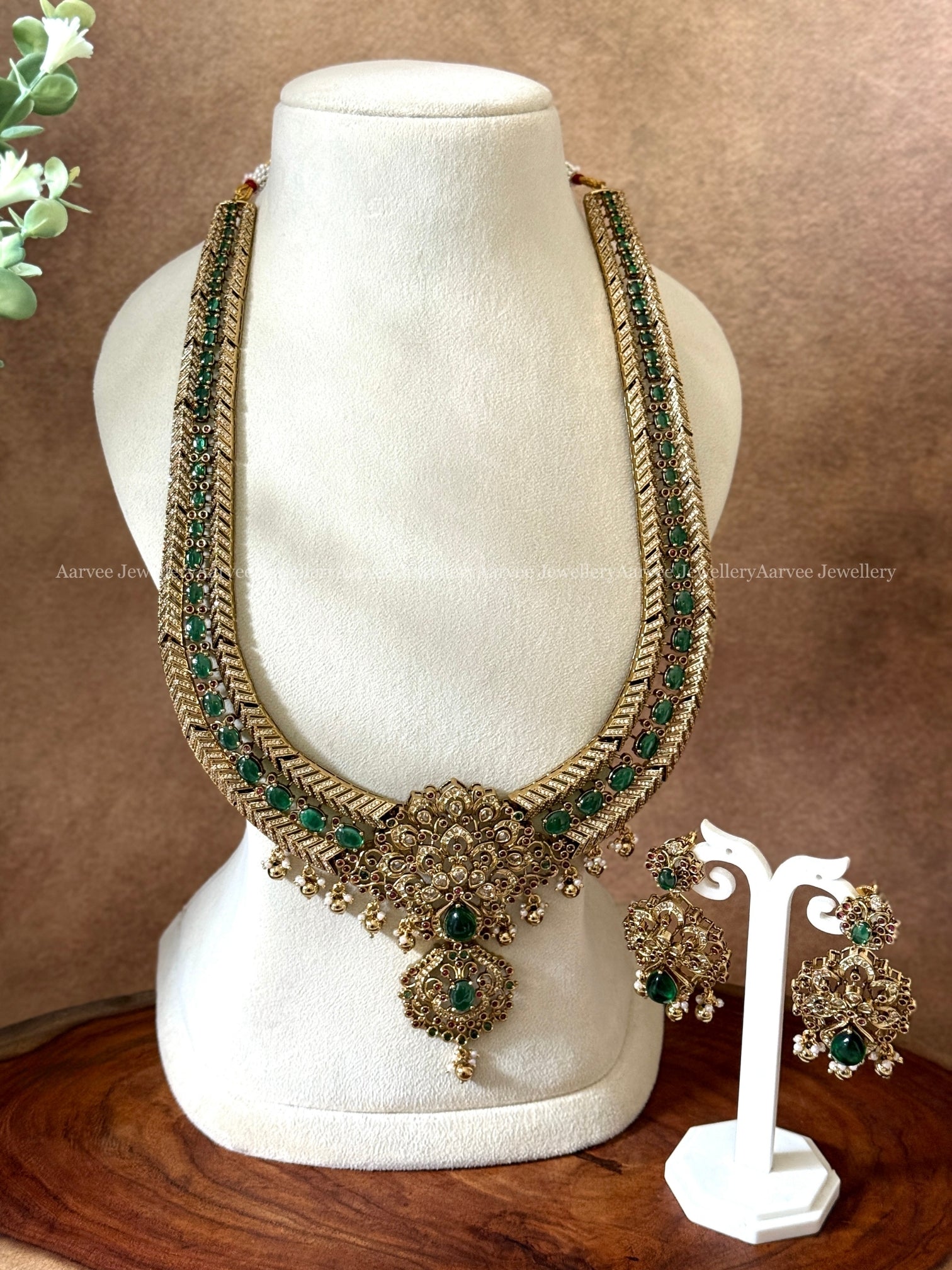 GREEN STONE PEACOCK DESIGN HARAM SET WITH GOLD BEADS - NON IDOL