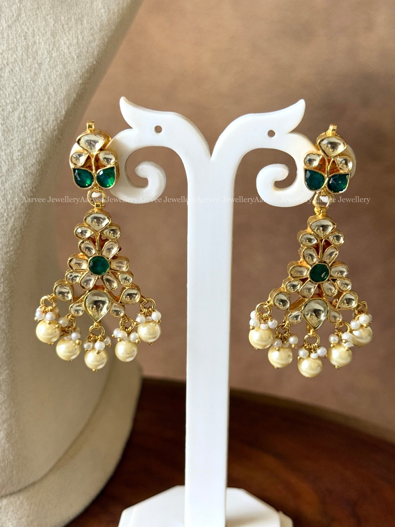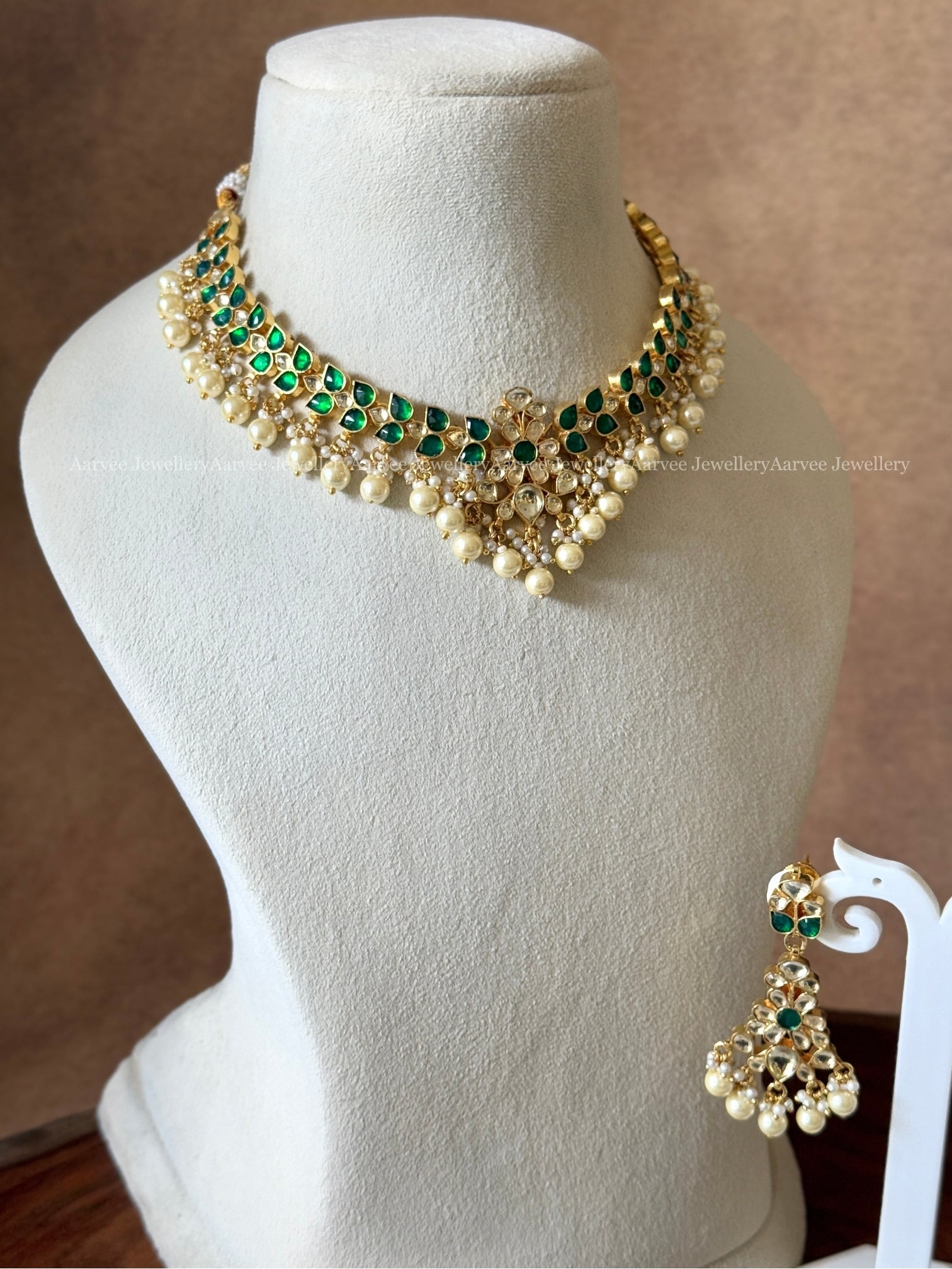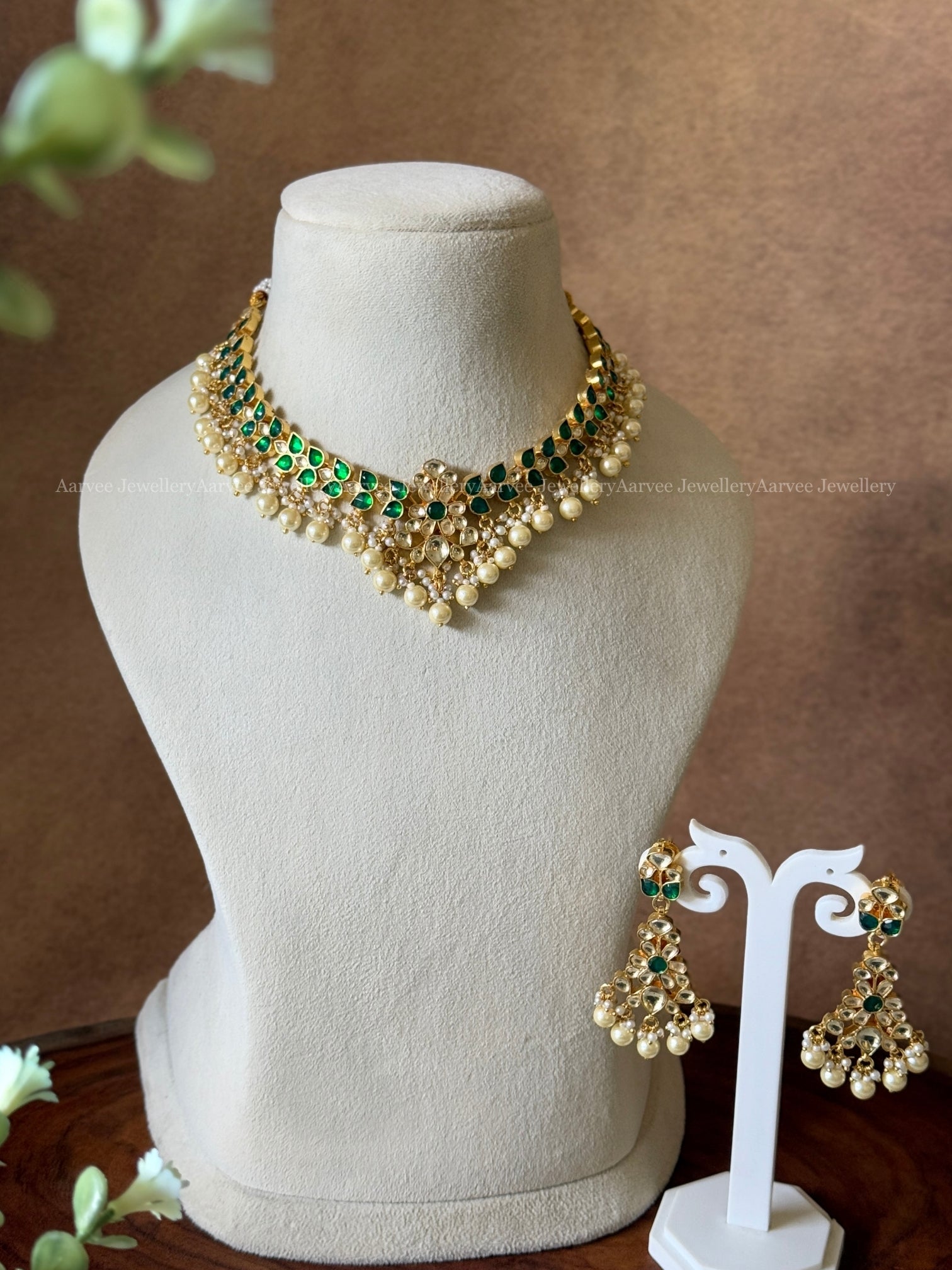 Elegant Polki Kundan Necklace Set Featuring Green Tear Drop Stones and Pearls