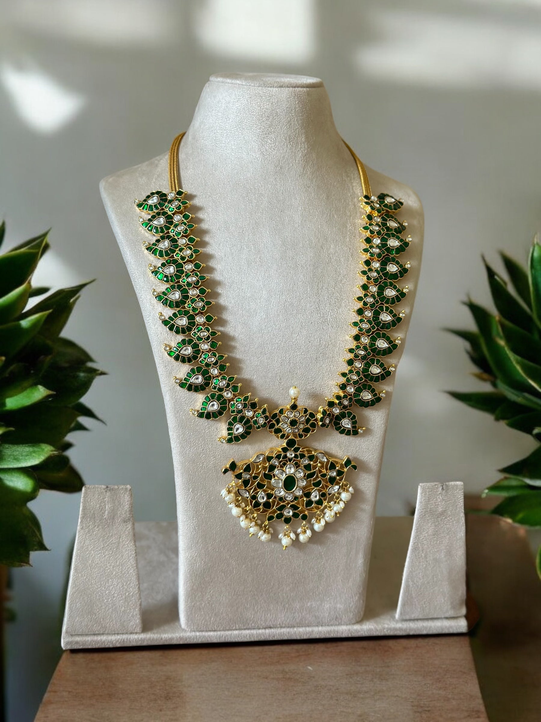 GREEN STONES JADAU KUNDAN MANGO MOTIF MIDLENGTH HARAM