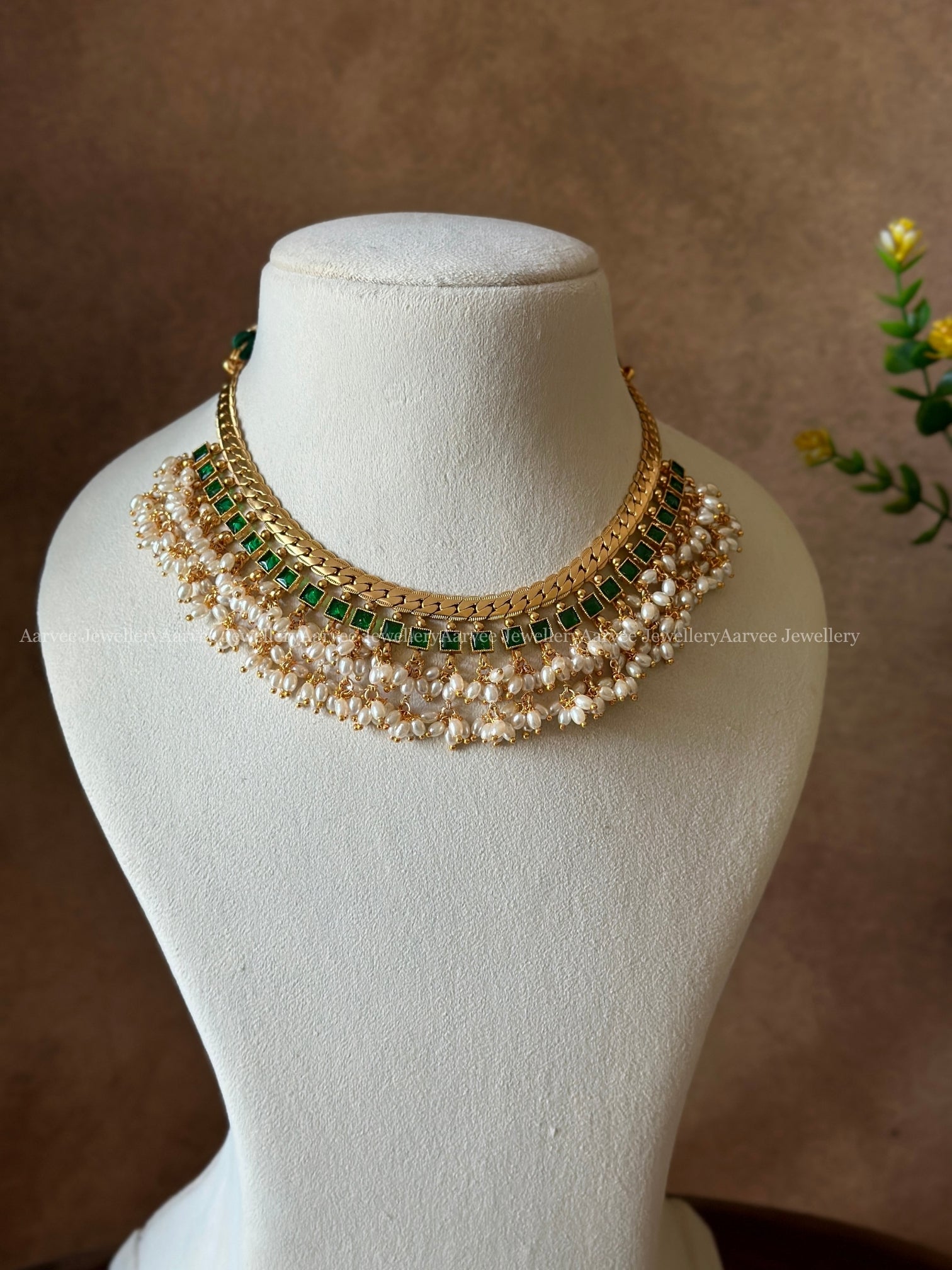 ELEGANT GREEN STONES NECKLACE WITH RICE PEARL BUNCH