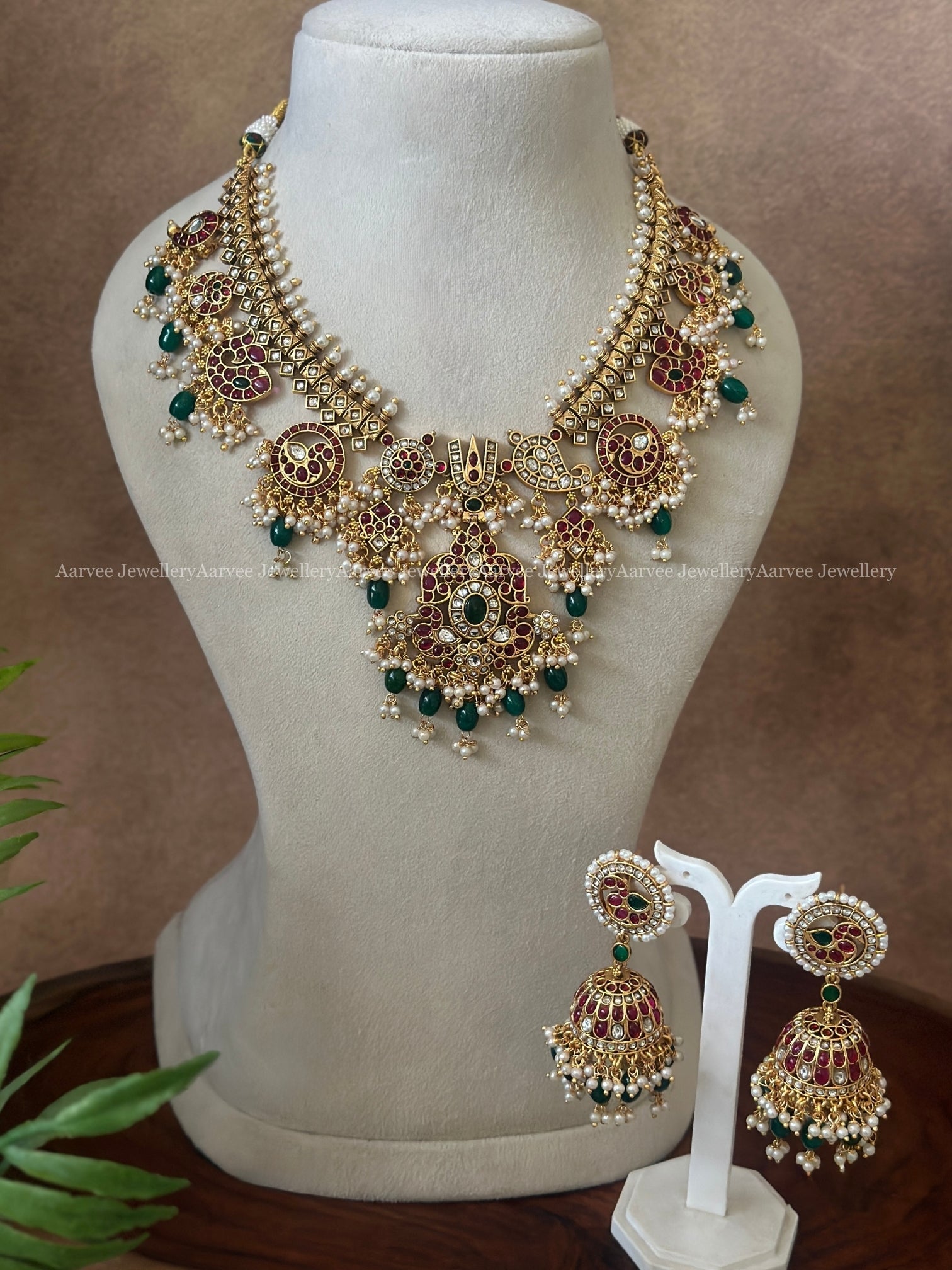 Traditional Gutta Pusalu necklace featuring ruby stones, pearls, and green beads for a vibrant, classic look