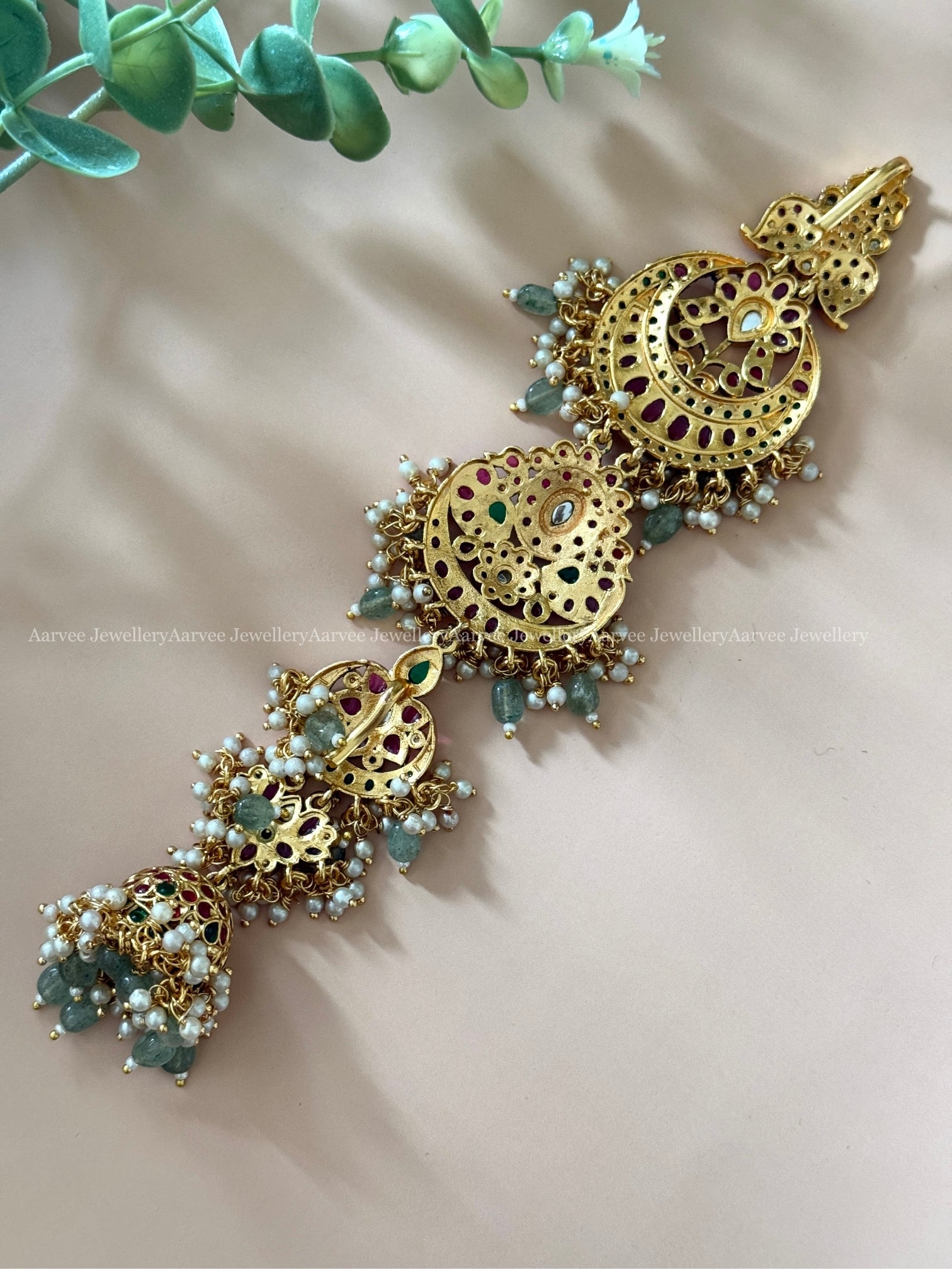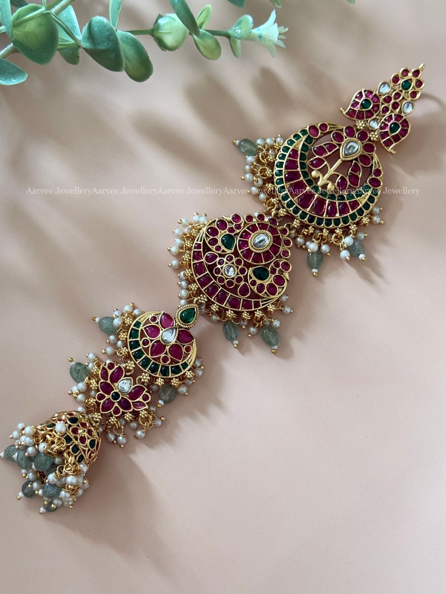 HAIR ACCESSORY WITH MANGO, LOTUS FLORAL MOTIF IN MULTI COLOR KEMP STONES WITH PASTEL BEADS MEDIUM LENGTH