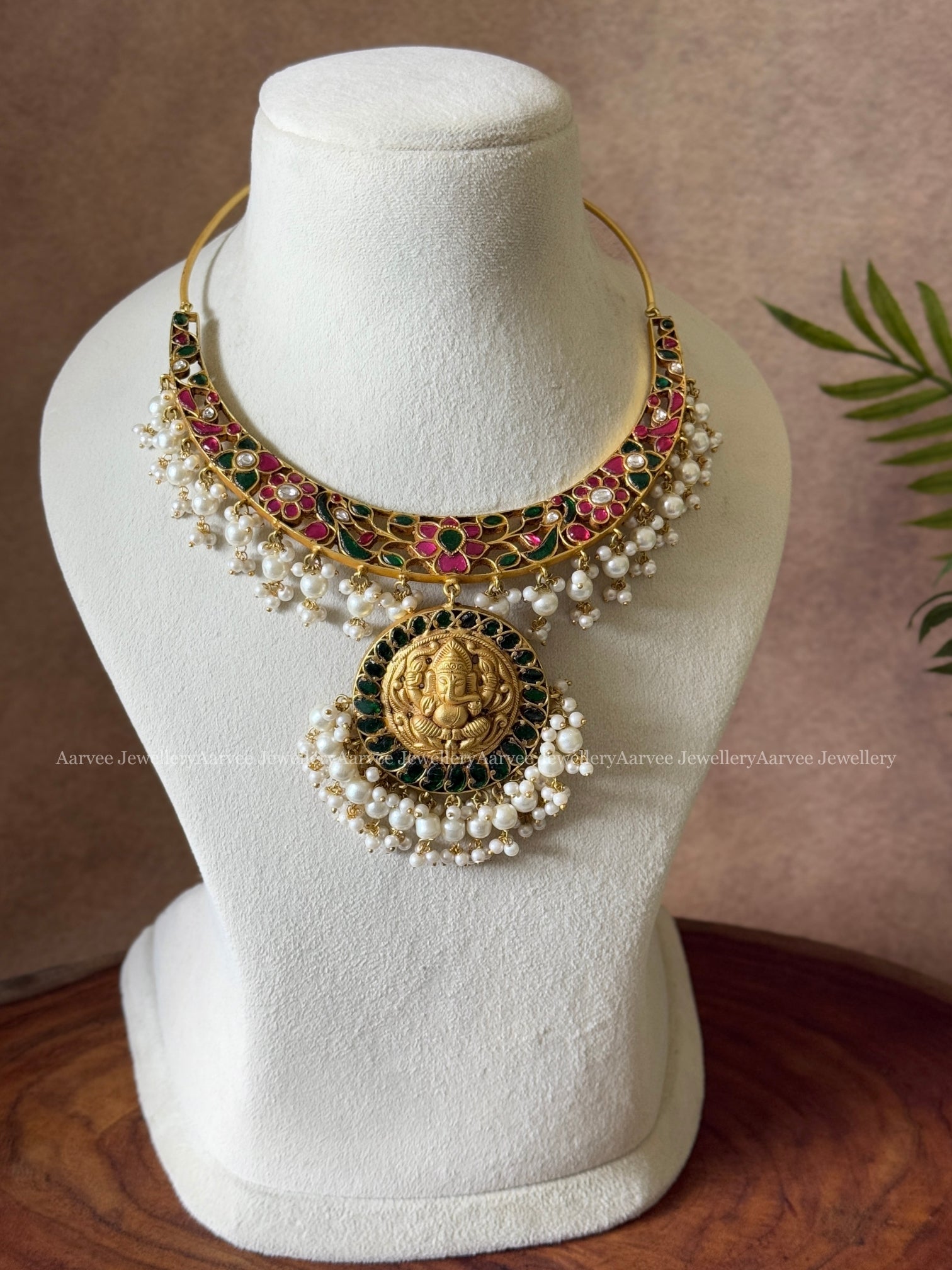 Hasli-Style Jadau Kundan Necklace with Ganesha Pendant and Pearl Bead Accents in Gold Finish