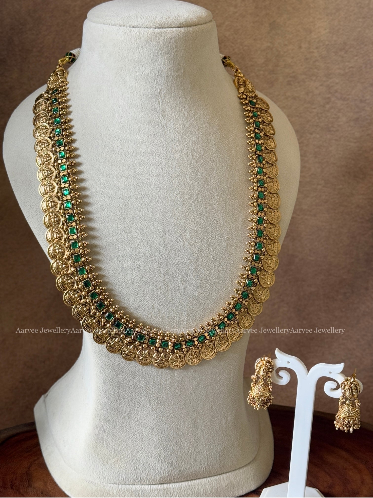 Premium Antique-Finish Mid-Length Lakshmi Coin Haram Set with Semi-Precious Green Kemp Stones