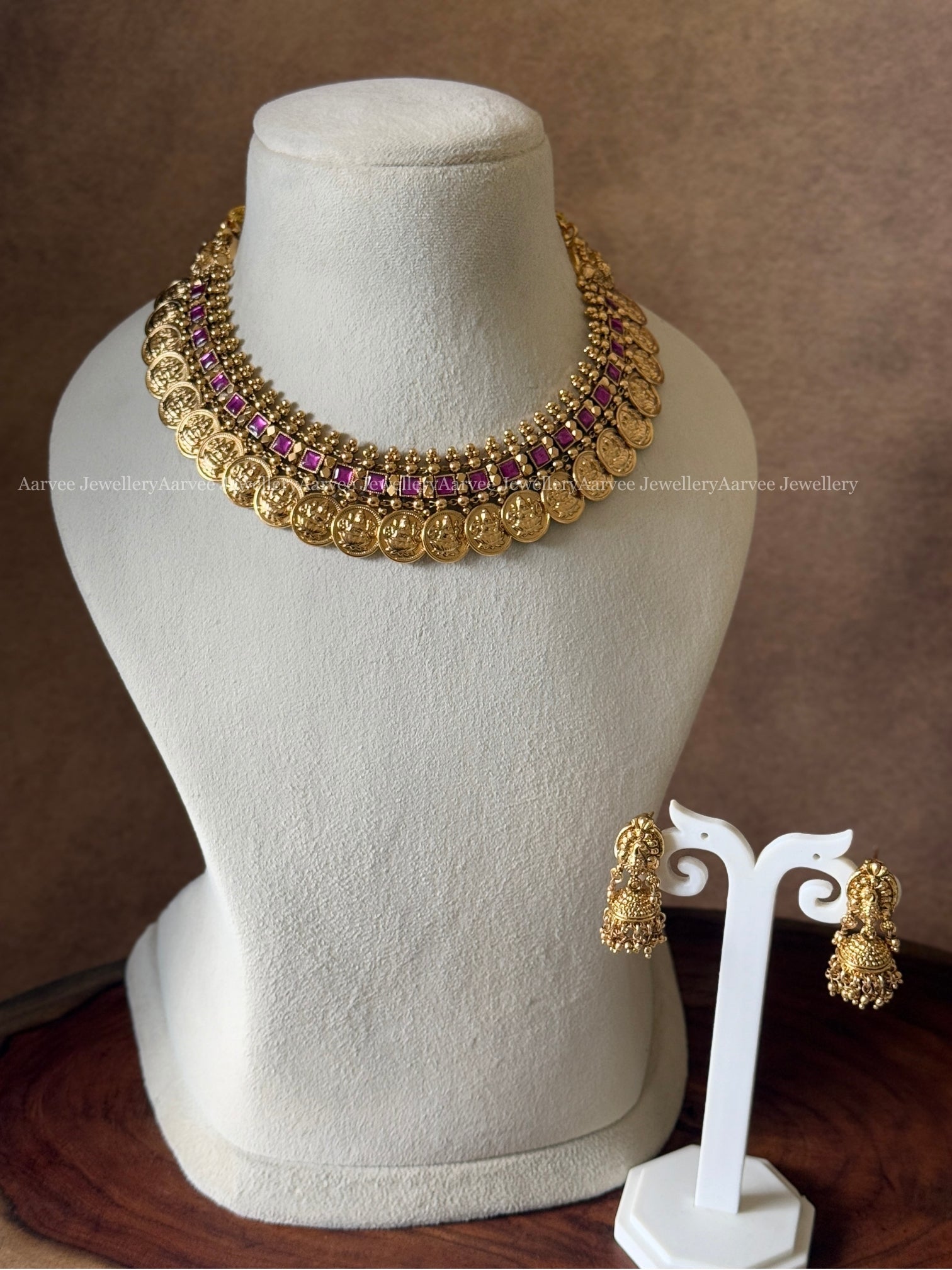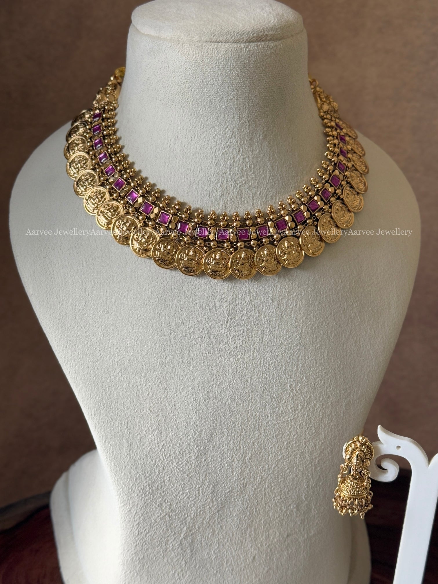 HIGH QUALITY ANTIQUE FINISH LAKSHMI COIN NECKLACE SET WITH SEMI PRECIOUS KEMP RUBY STONES