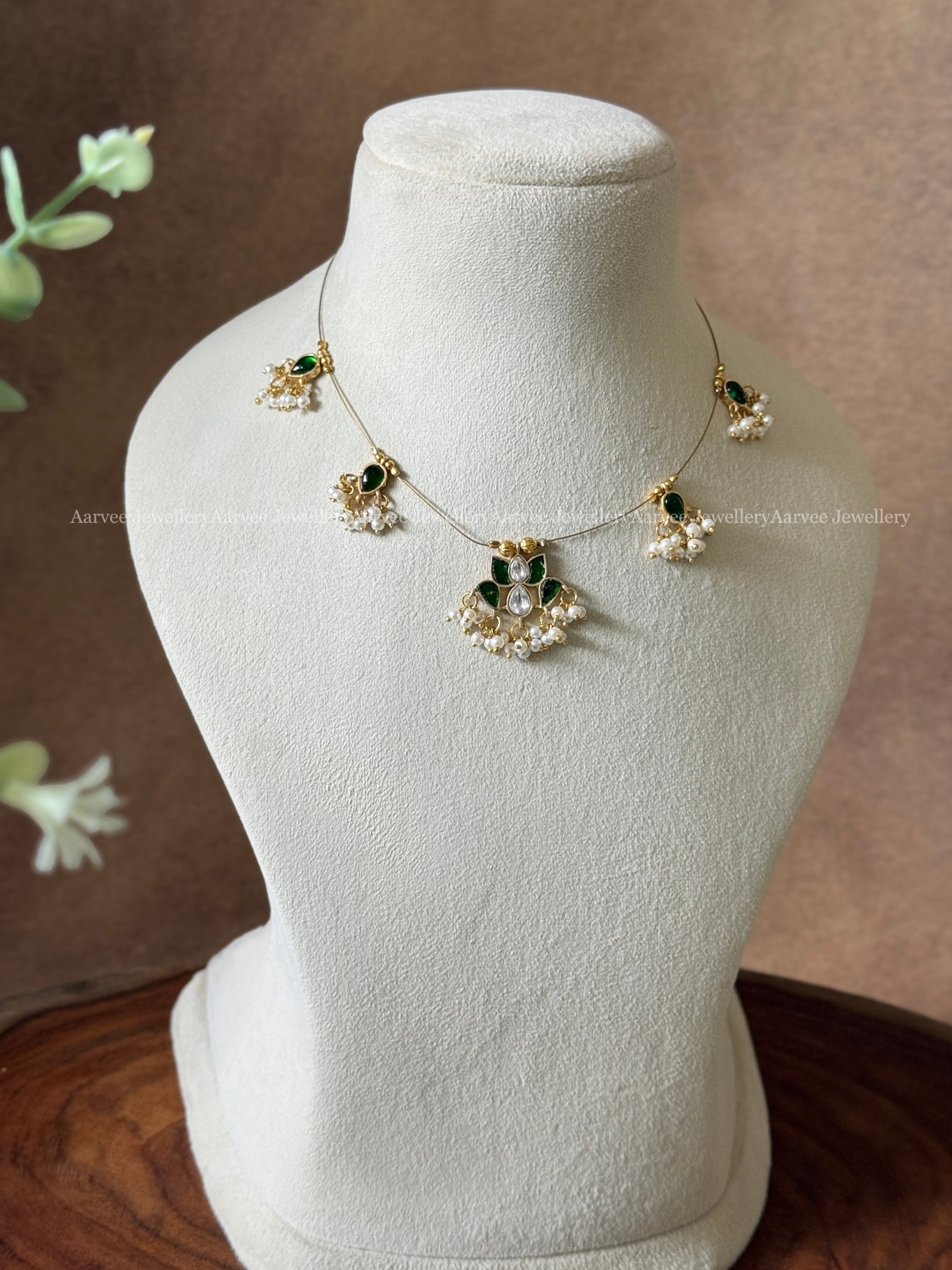 Elegant Invisible Necklace with Lotus Pendant Highlighted by Green and White Kundan