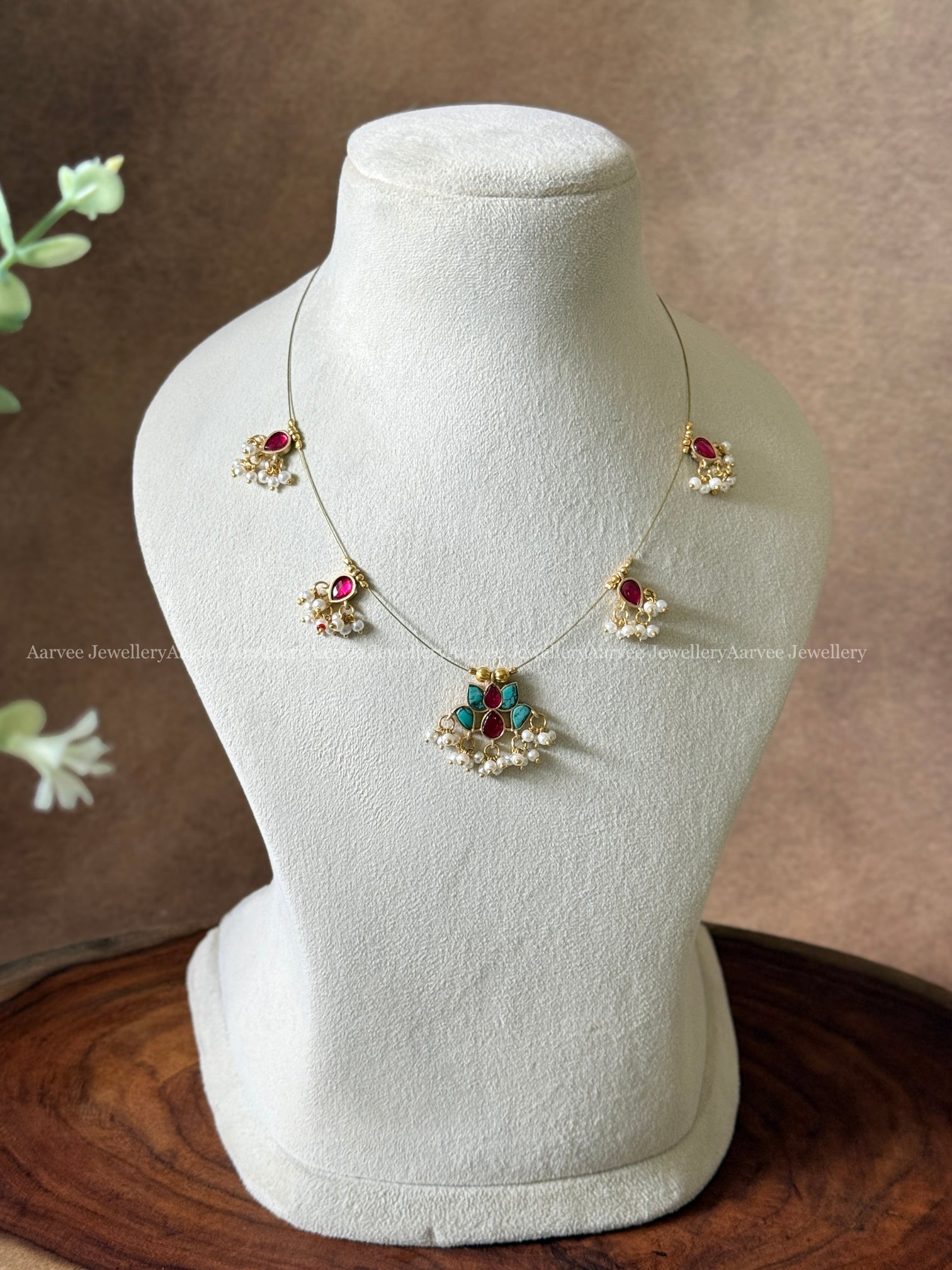 INVISIBLE CHAIN WITH LOTUS PENDANT IN TURQUOISE / PINK KUNDAN STONE