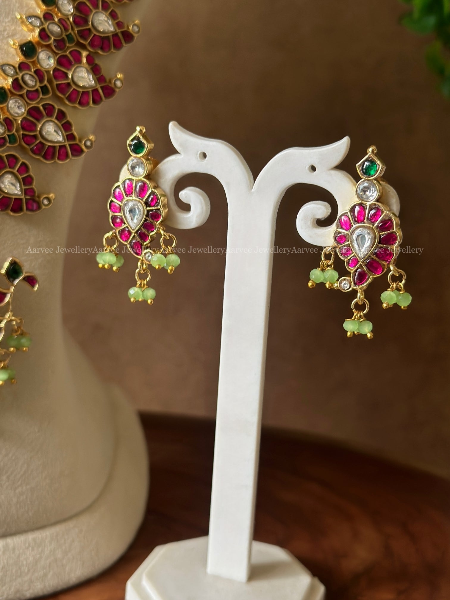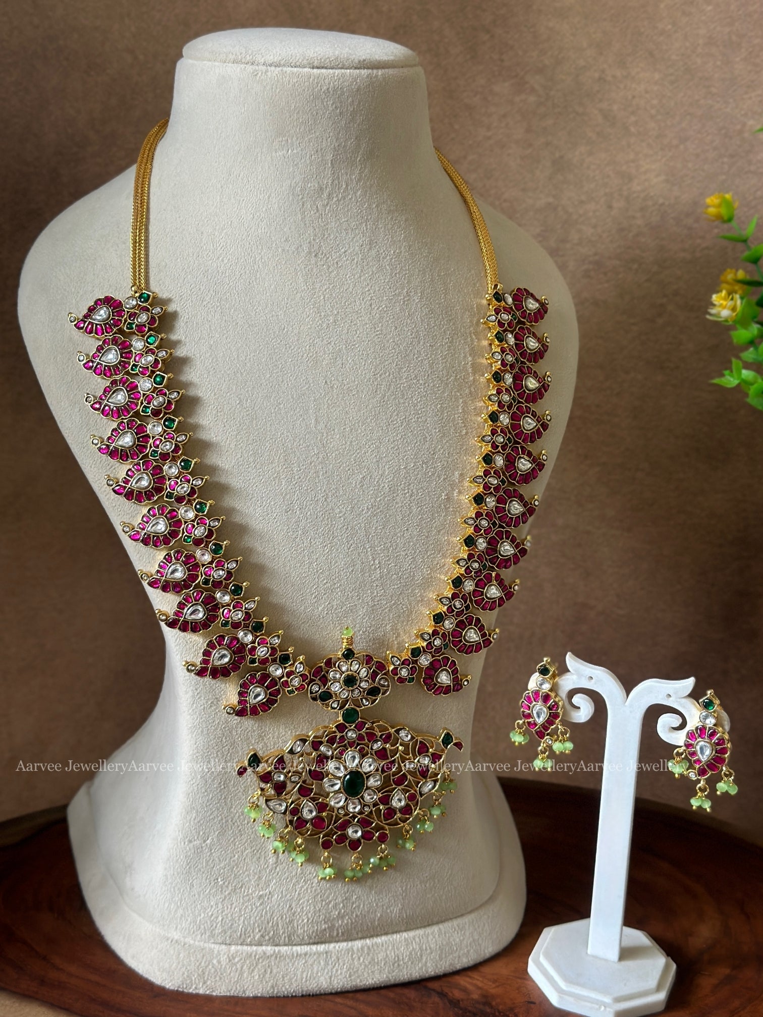 JADAU KUNDA RUBY STONE MANGO MOTIF HARAM SET WITH FLORAL PENDANT & TINY GREEN BEADS