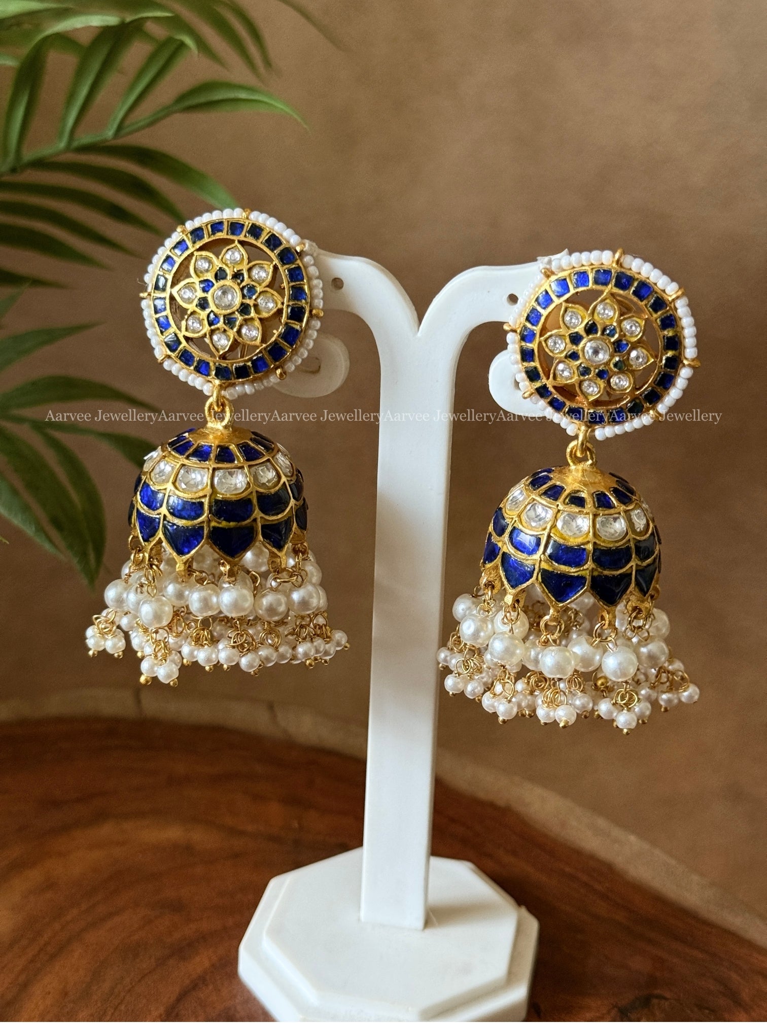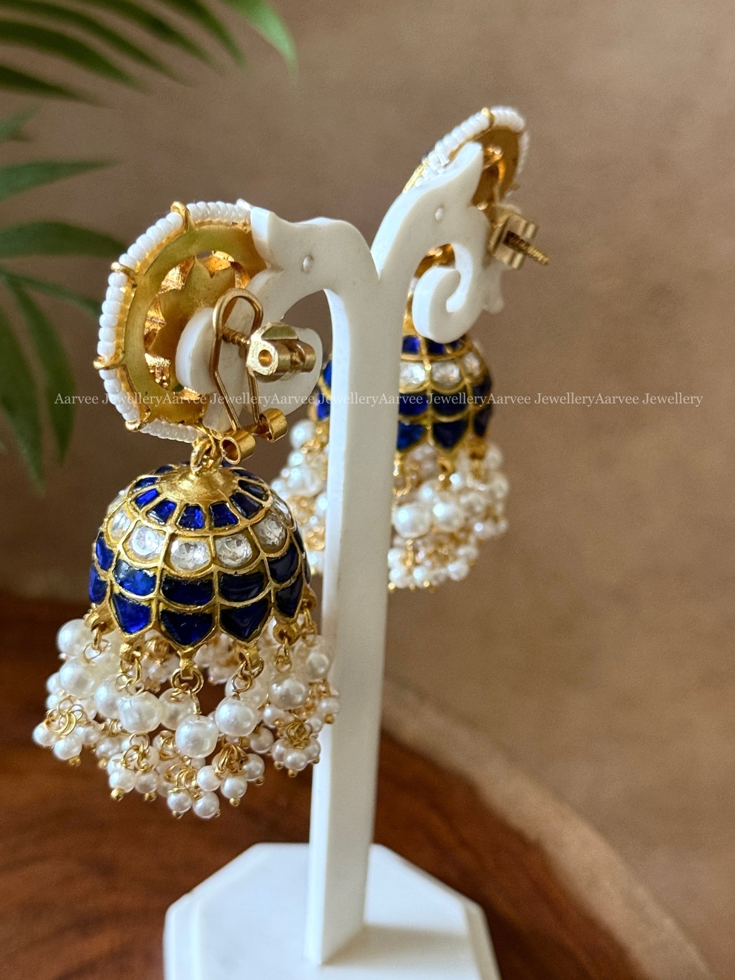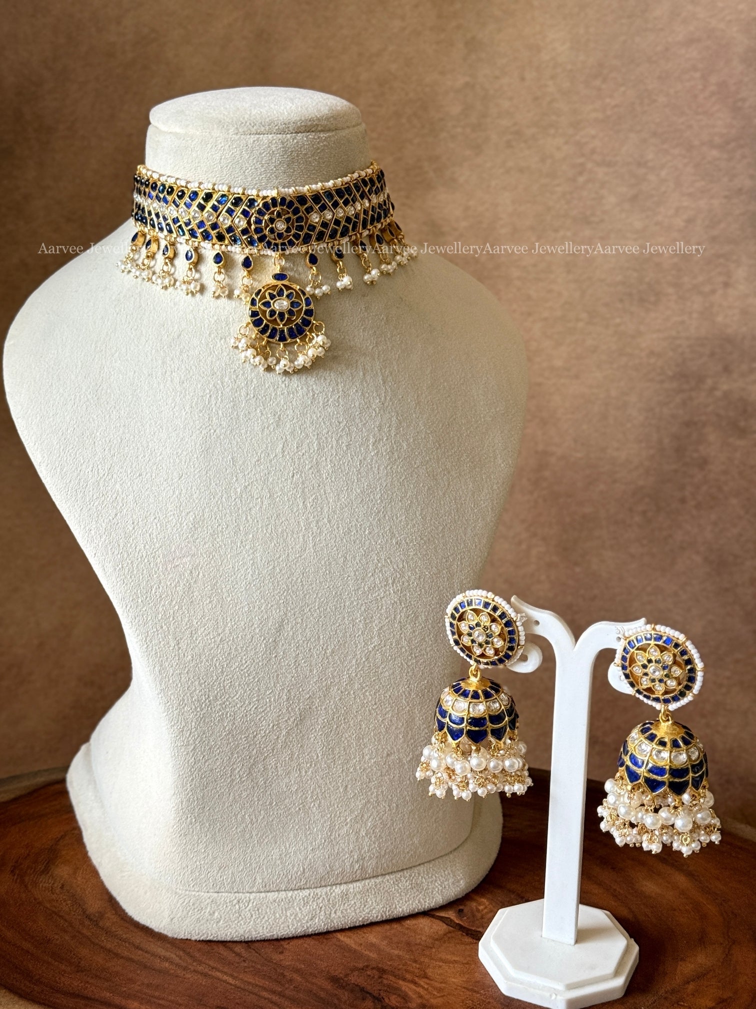 JADAU KUNDAN ADITI CHOKER WITH BUTTA JHUMKI WITH BLUE STONES & PEARLS