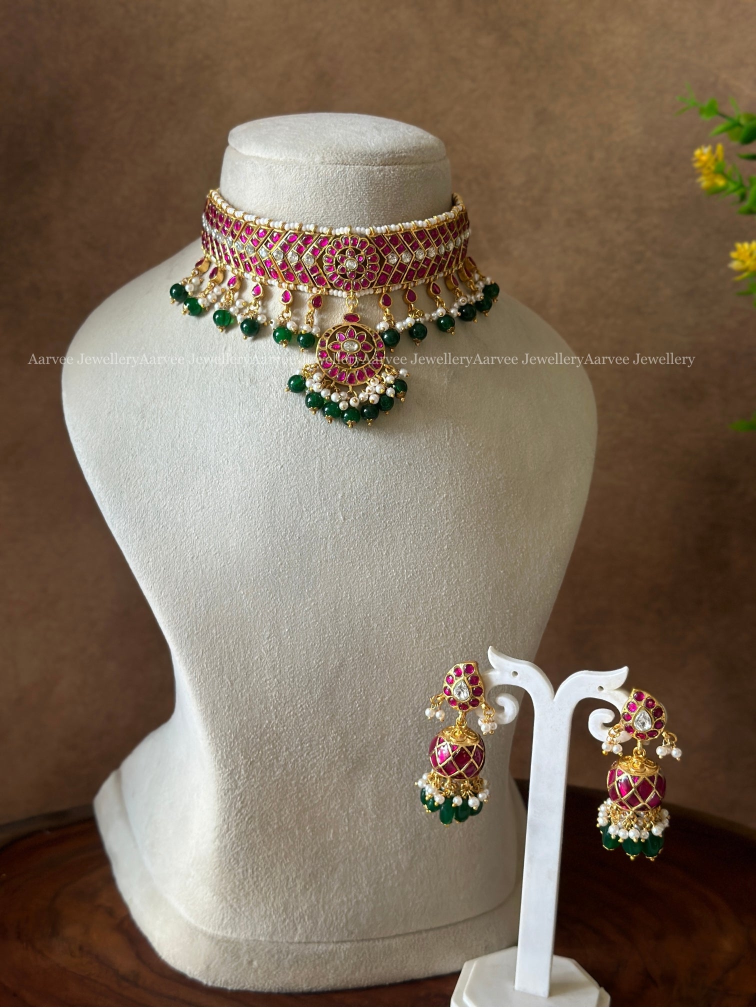 JADAU KUNDAN ADITI INSPIRED CHOKER SET WITH RUBY STONES & GREEN BEADS