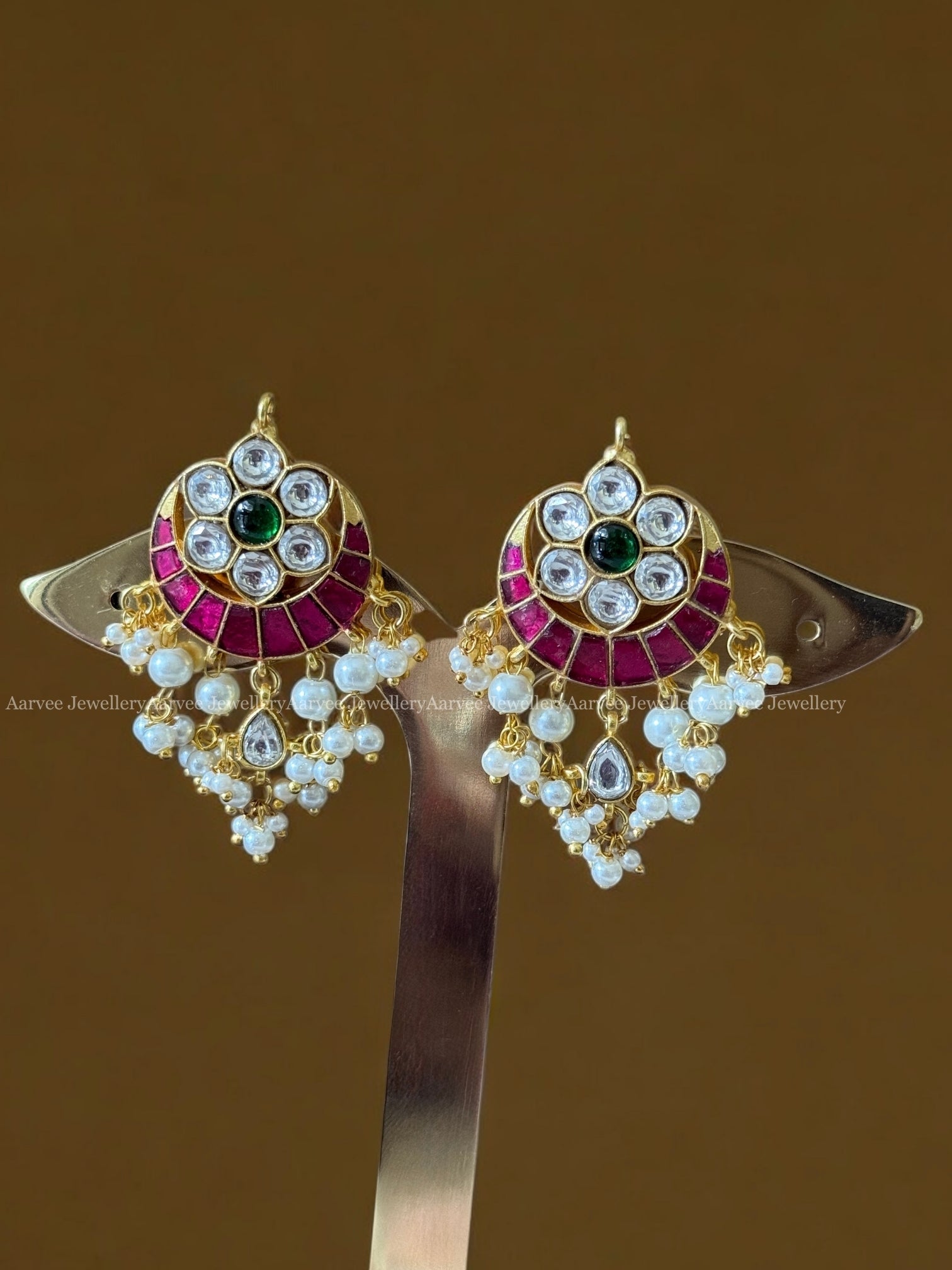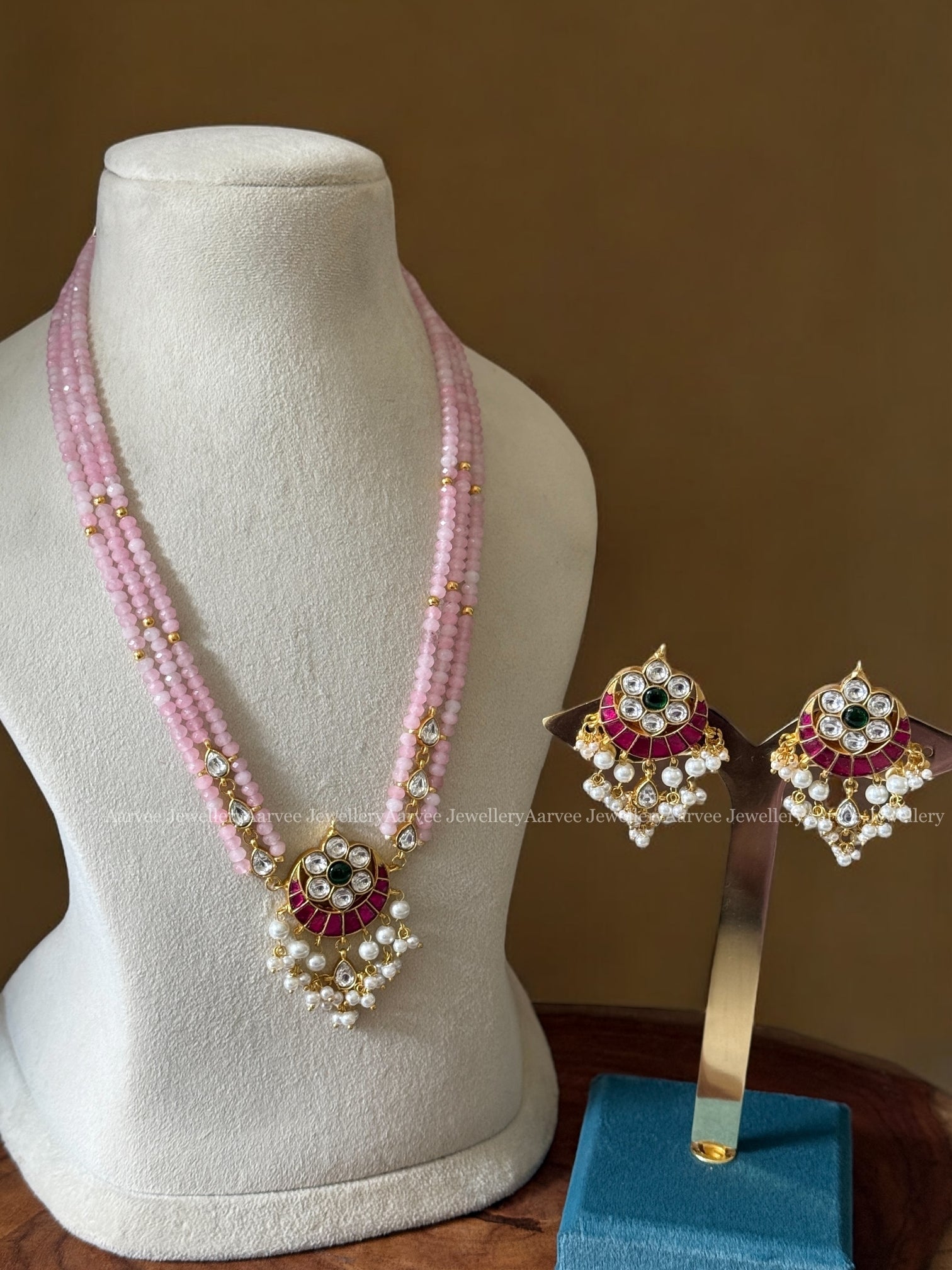 Elegant Baby Pink Beaded Jadau Kundan Necklace Featuring Chand Design Pendant