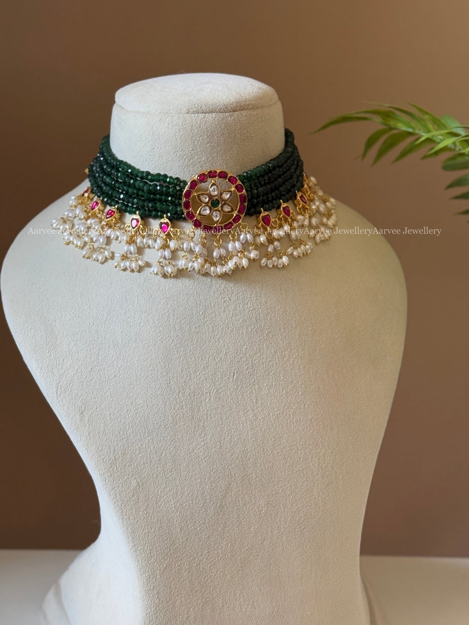 Traditional Jadau Kundan choker with green beads and a beautifully crafted floral pendant centerpiece