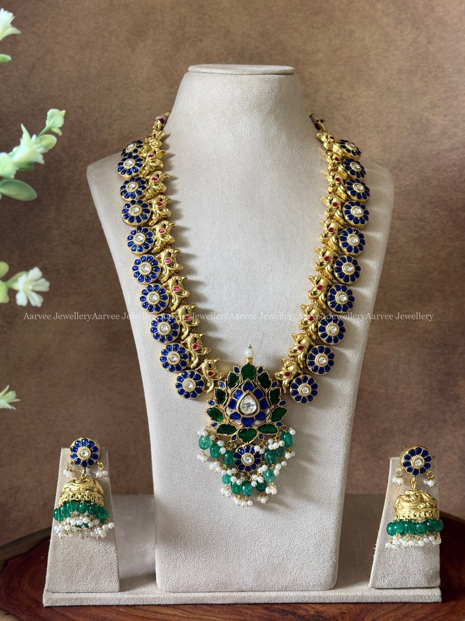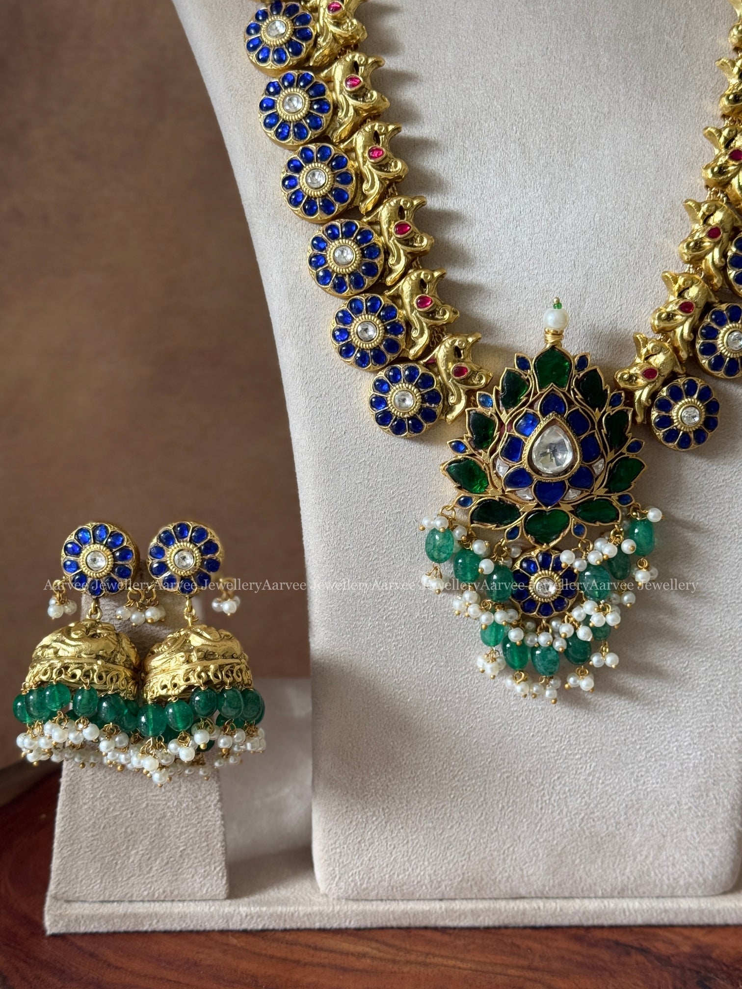JADAU KUNDAN BLUE STONE BUTTA HARAM SET WITH LOTUS PENDANT IN GREEN BEADS