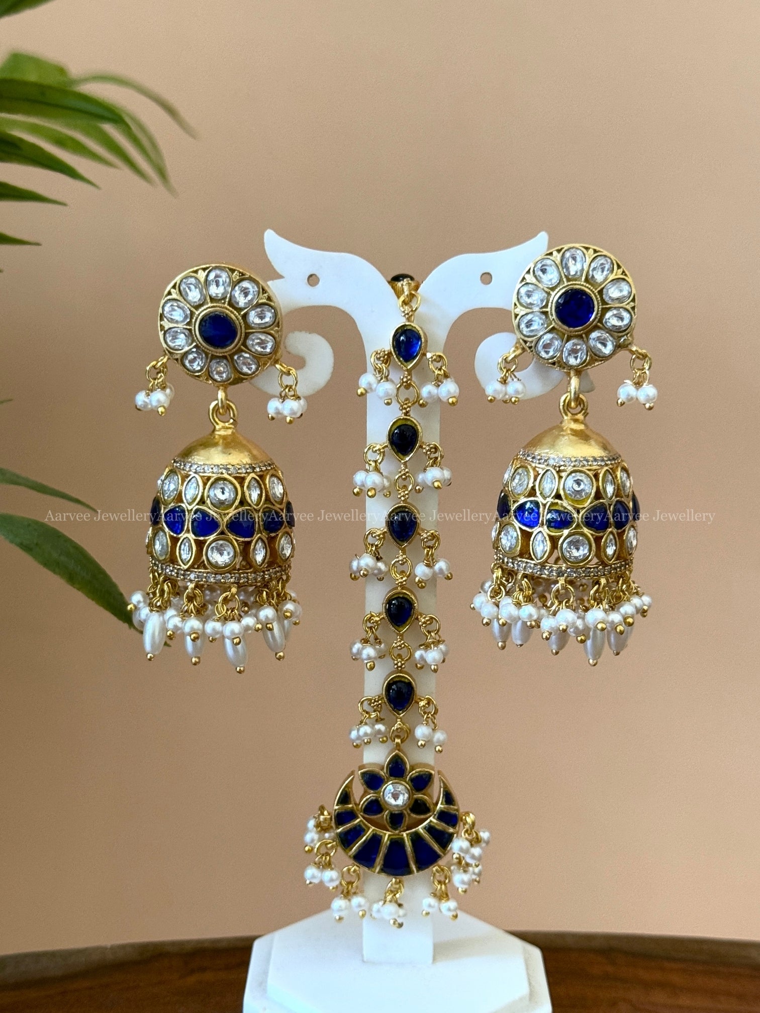 JADAU KUNDAN BRIDAL SET WITH BLUE STONES AND PEARLS
