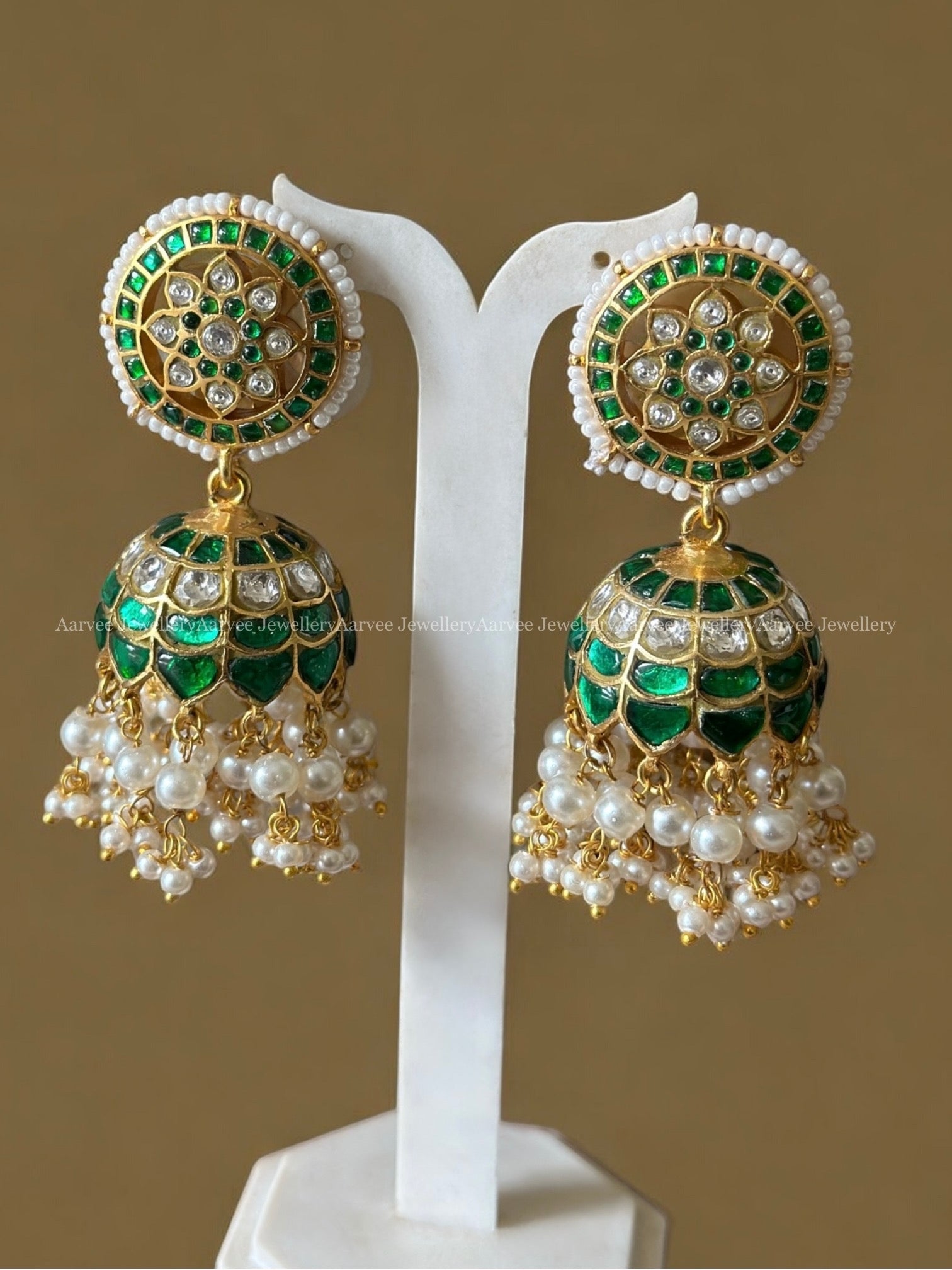 JADAU KUNDAN BUTTA JHUMKI WITH GREEN STONES & PEARLS