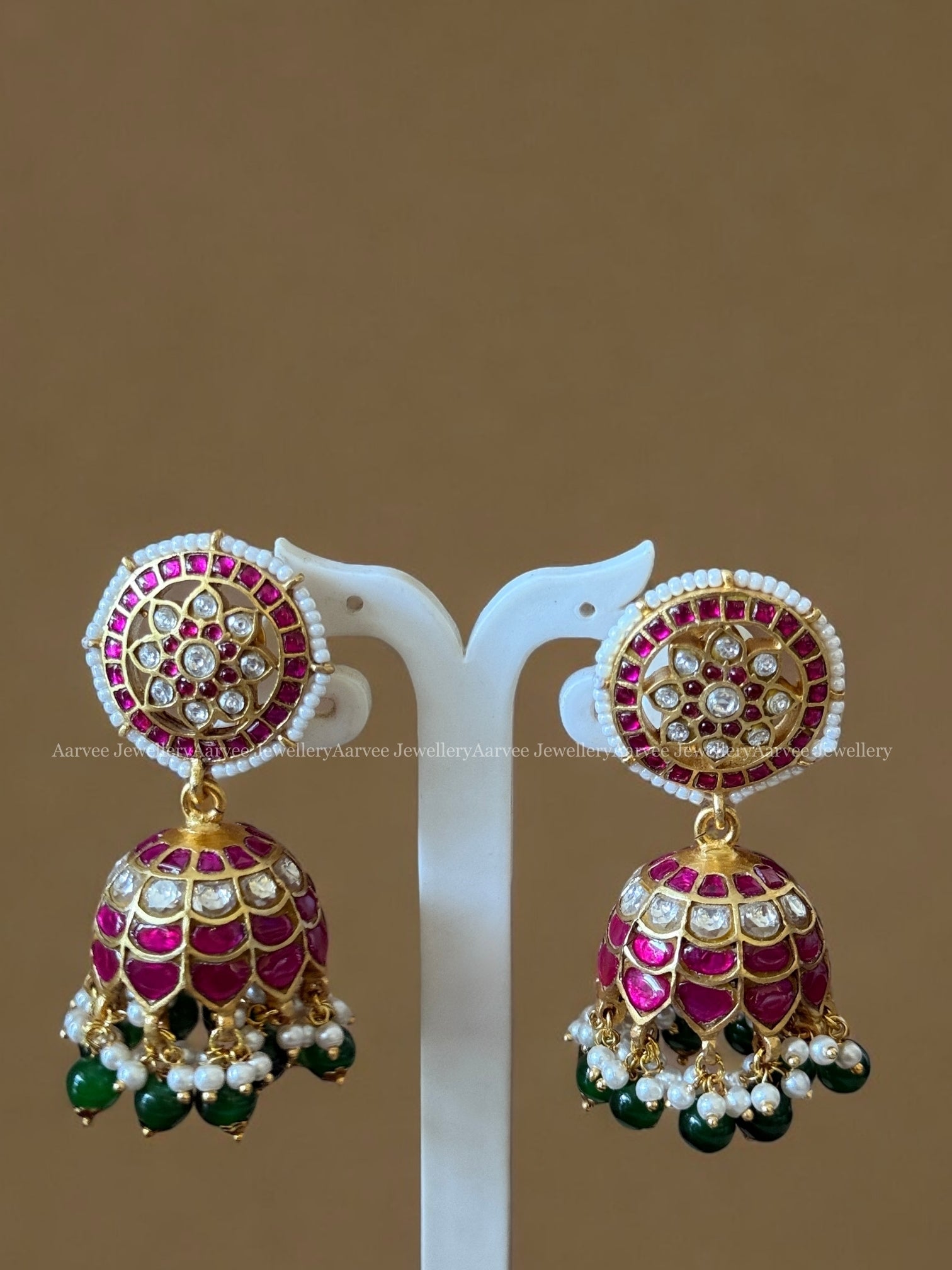 JADAU KUNDAN BUTTA JHUMKI WITH PINK STONES & GREEN BEADS
