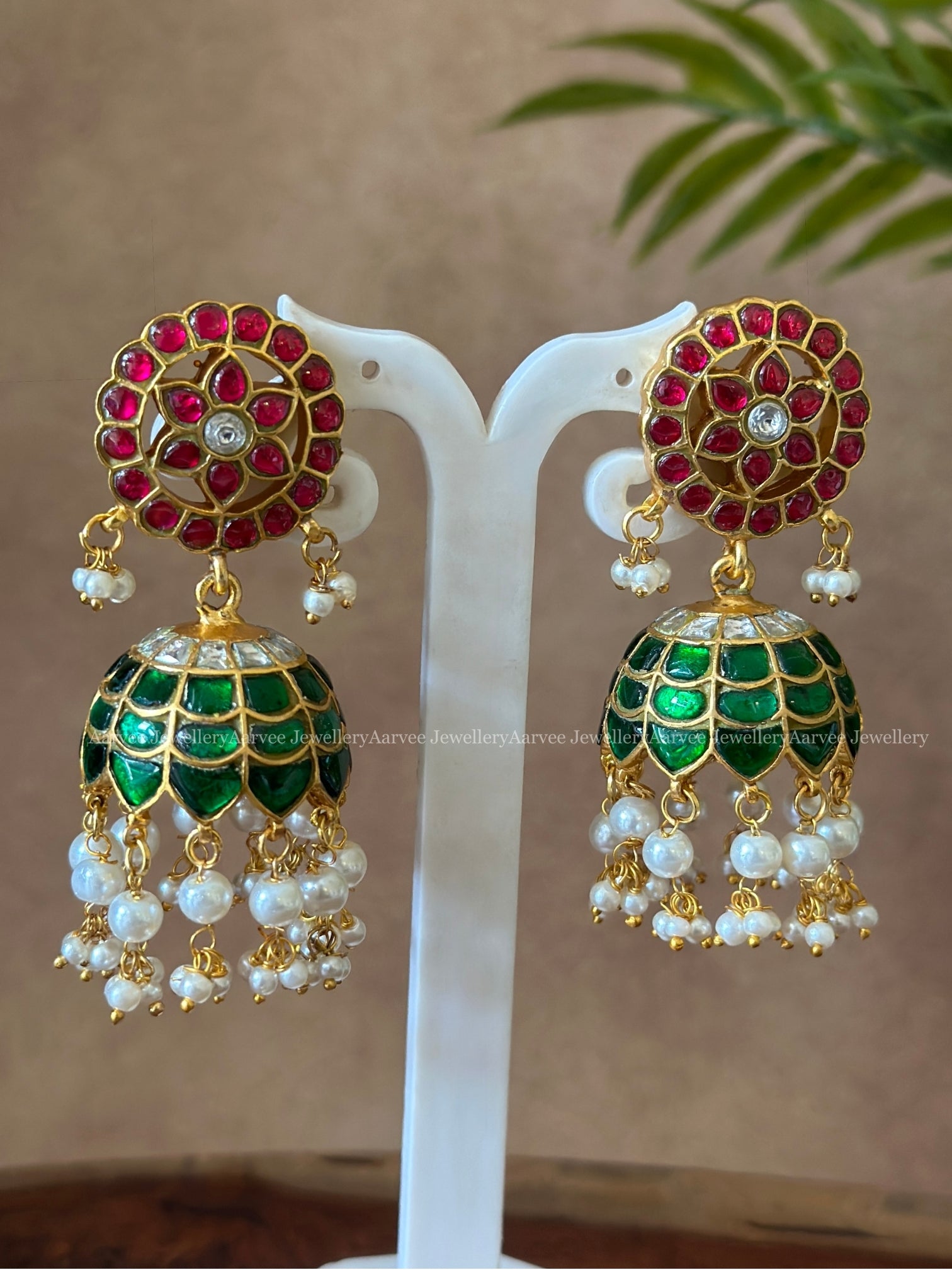 Stunning jadau kundan butta jhumkis with a blend of ruby and green stones, beautifully detailed with pearl embellishments