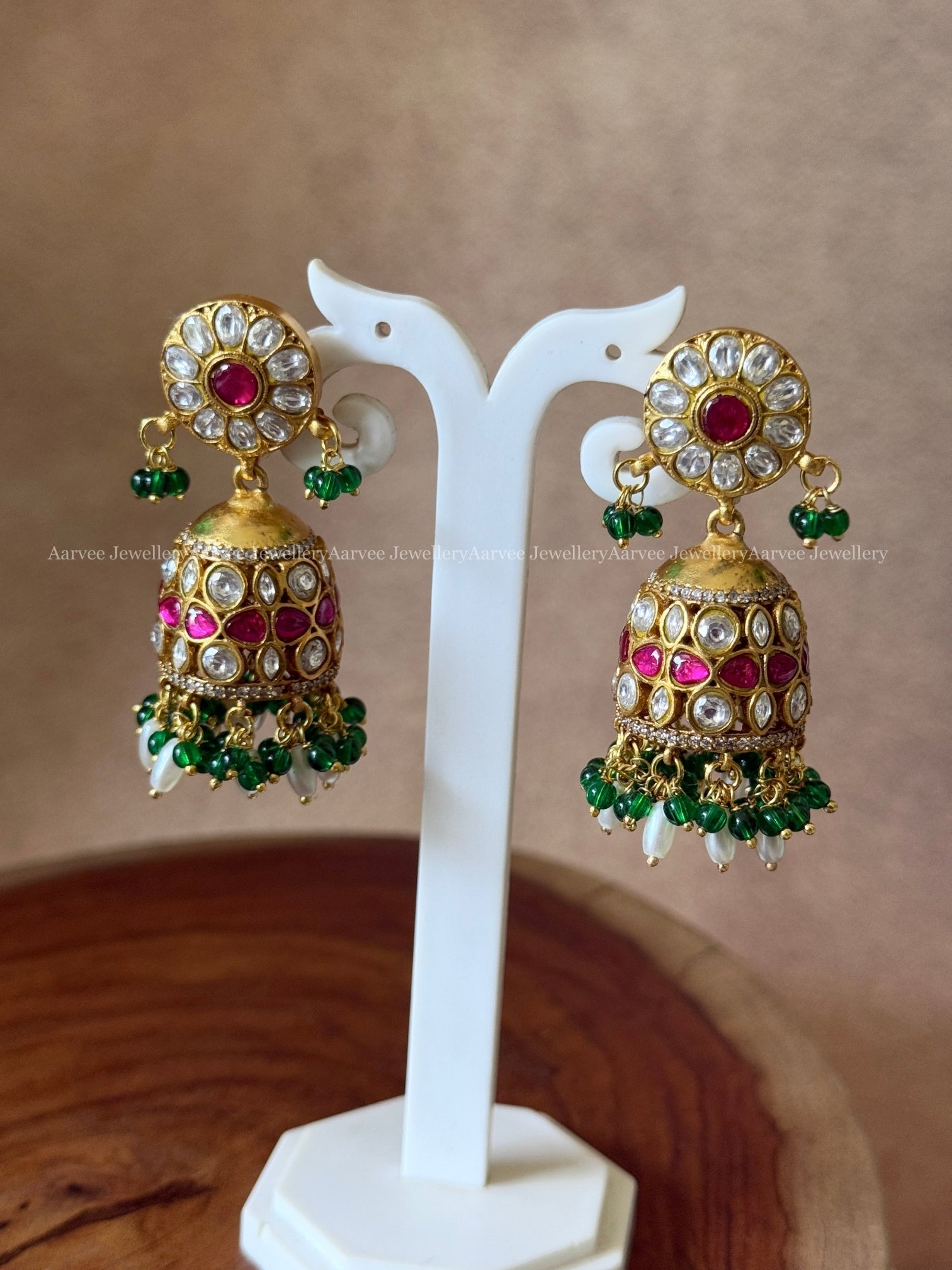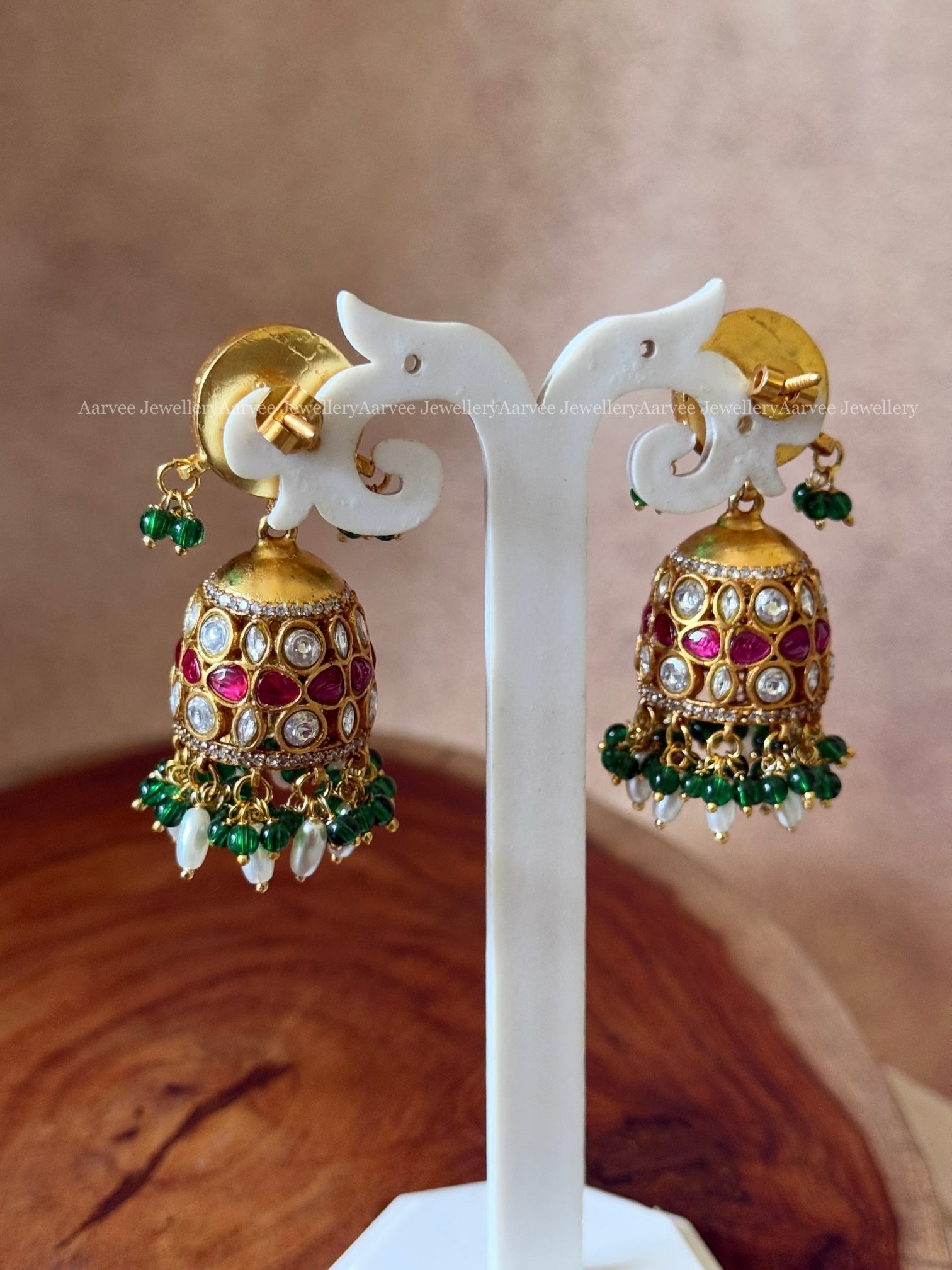 JADAU KUNDAN BUTTA JHUMKI WITH WHITE / PINK STONES AND MIX OF GREEN BEADS & PEARLS