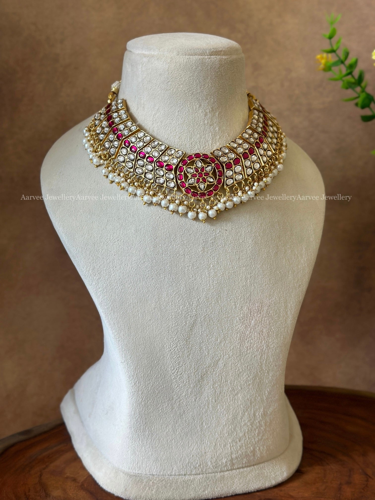 JADAU KUNDAN BUTTA NECKLACE WITH WHITE AND PINK STONES & PEARLS
