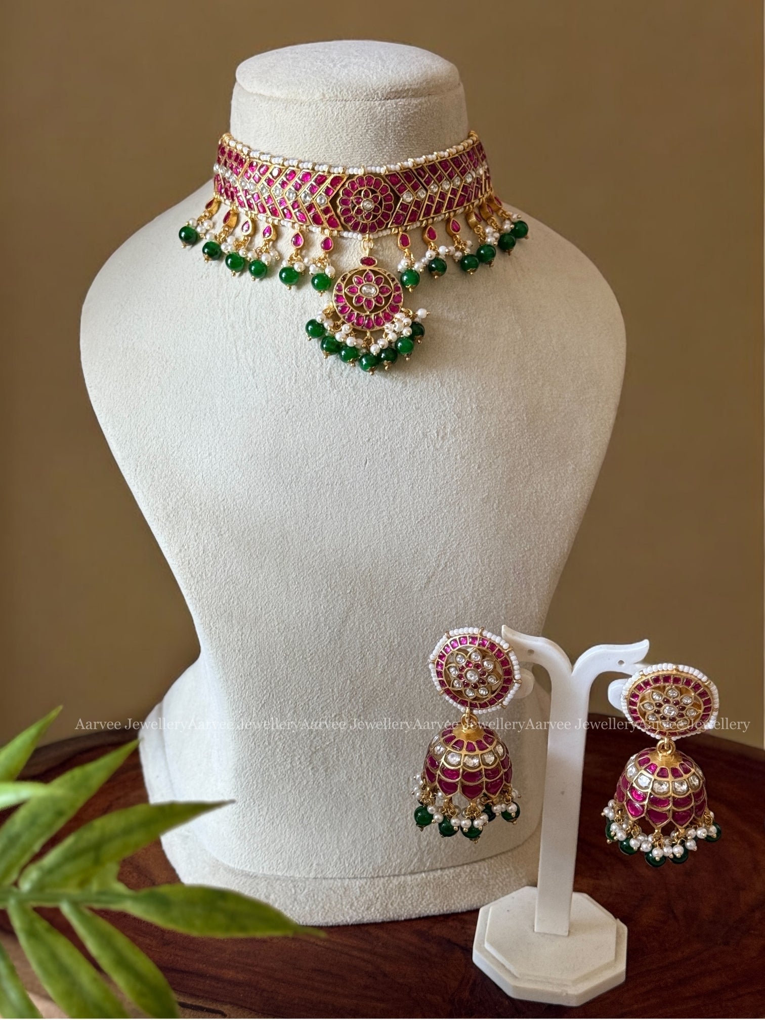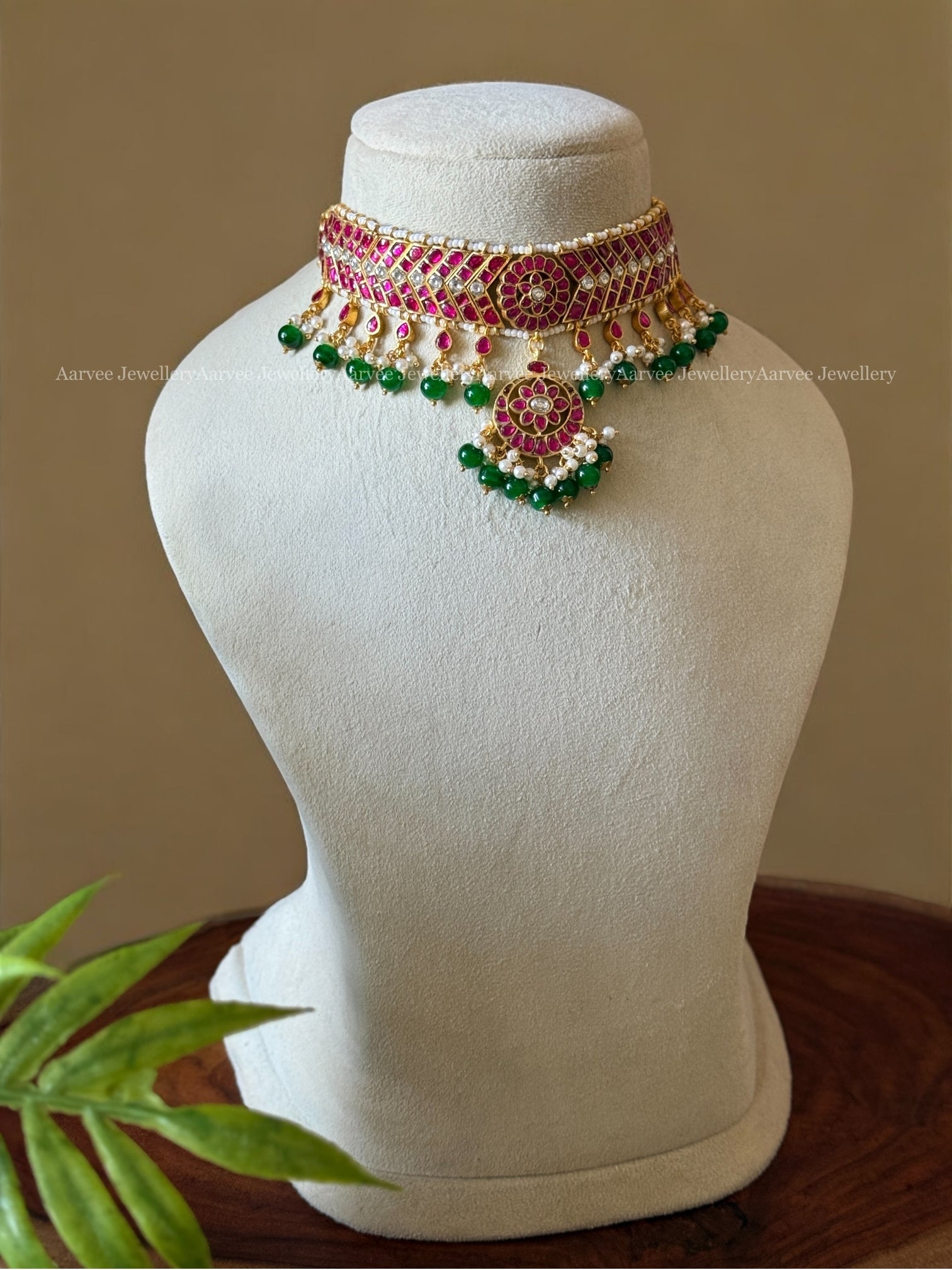 JADAU KUNDAN ADITI CHOKER SET WITH PINK KUNDAN STONES & GREEN BEADS