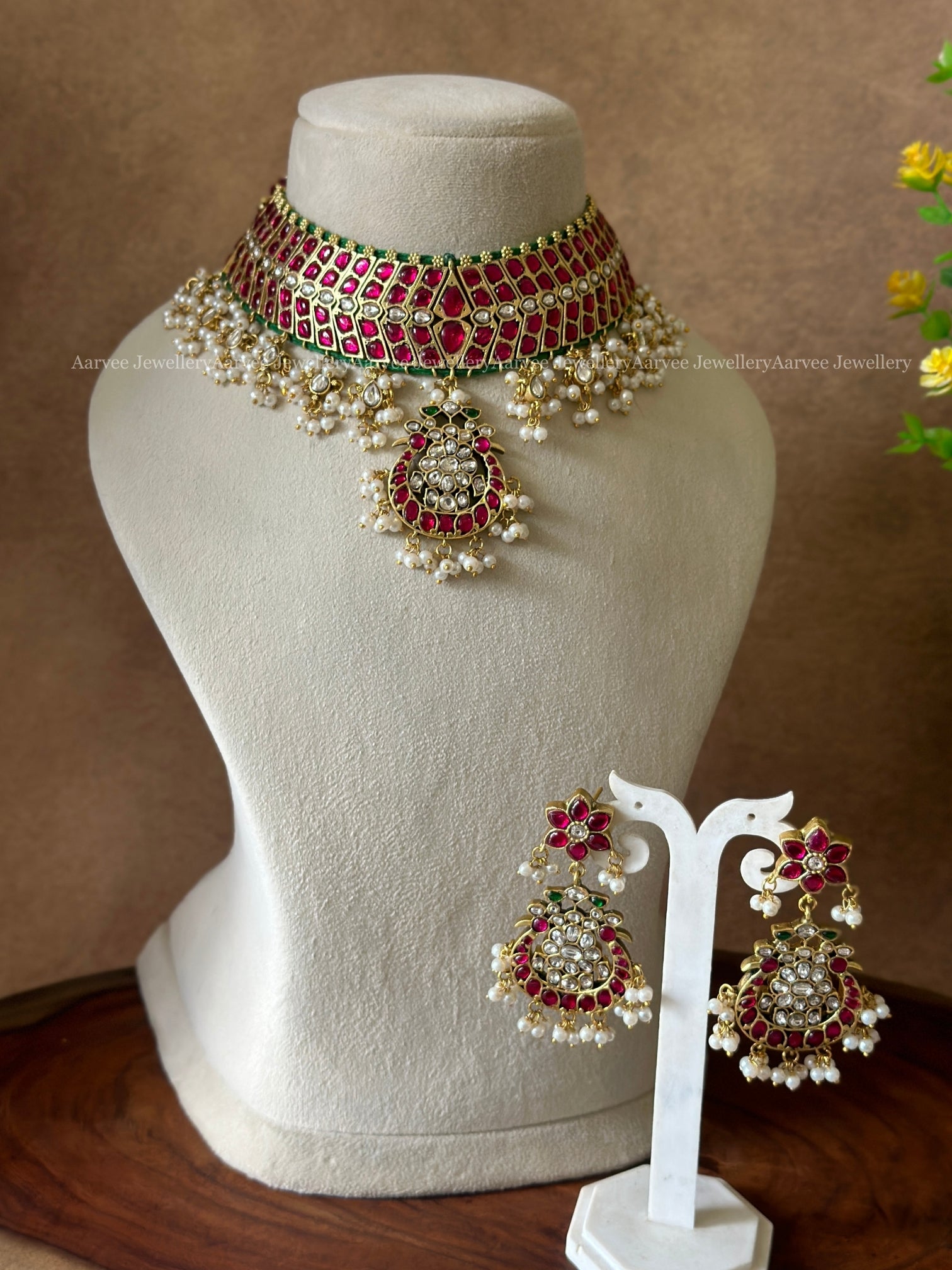 Regal Jadau Kundan floral choker set, adorned with brilliant ruby stones and soft pearl embellishments