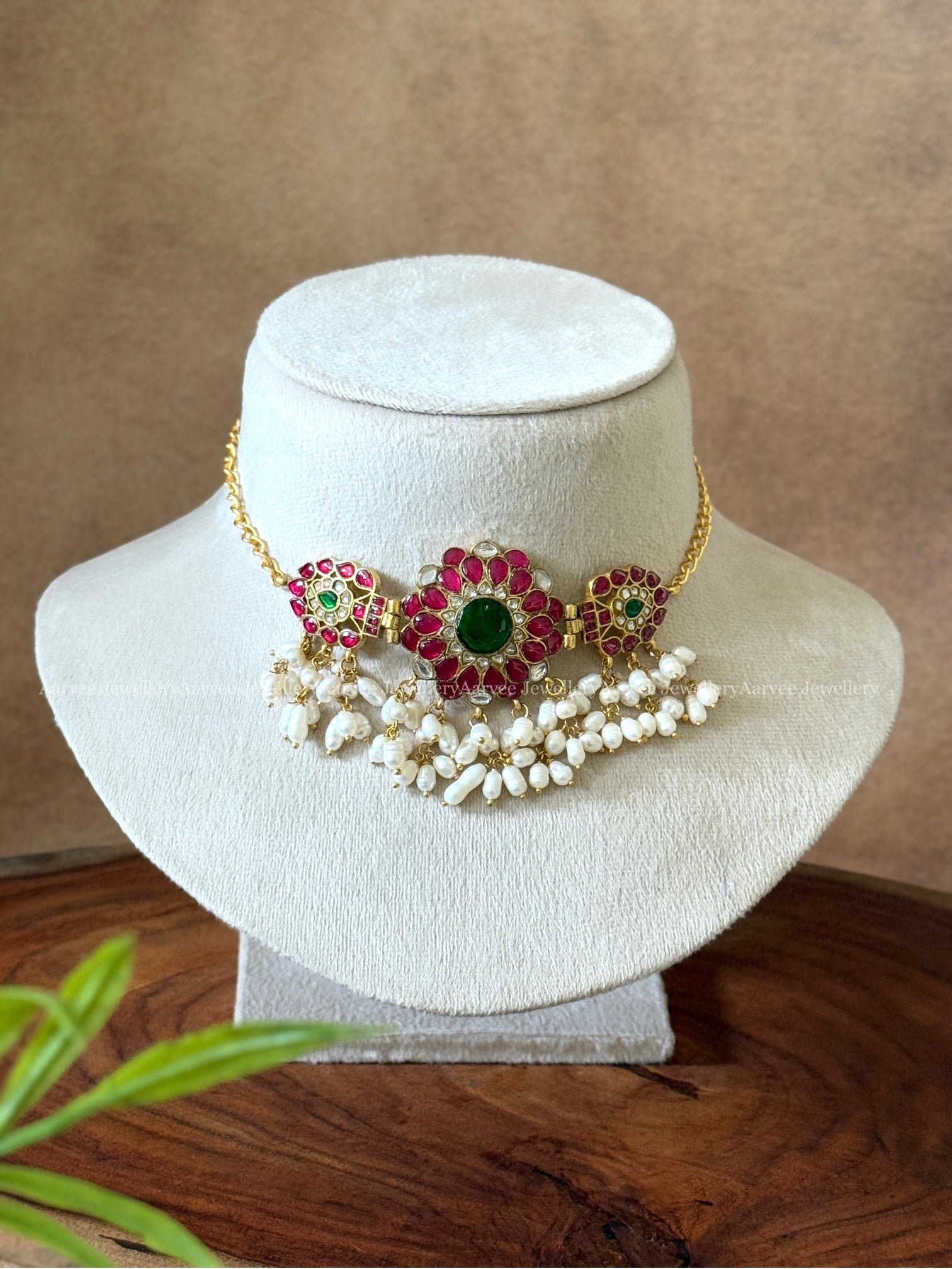JADAU KUNDAN FLORAL CHOKER WITH RUBY & GREEN STONES WITH RICE PEARLS