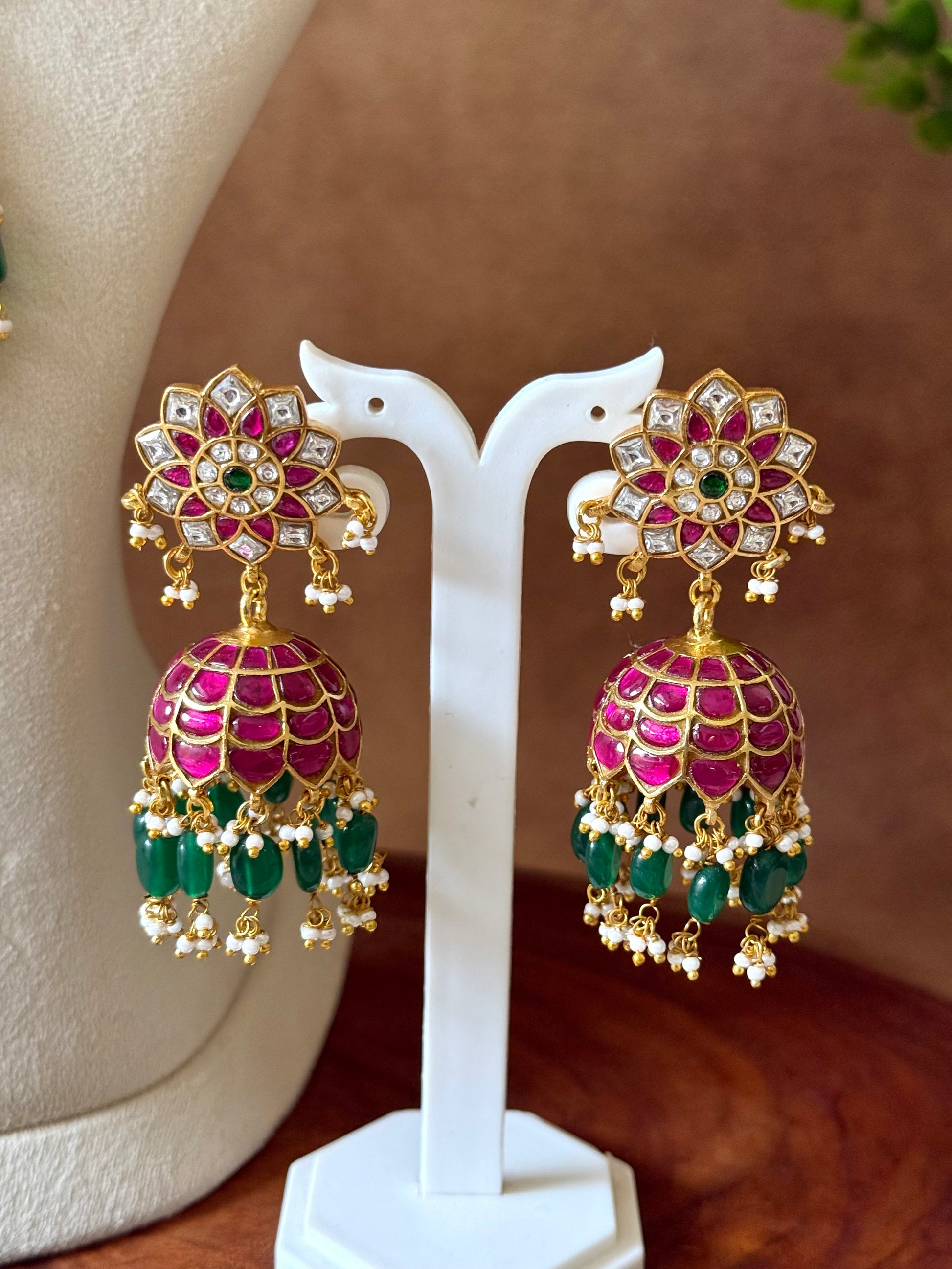 JADAU KUNDAN FLORAL JHUMKI WITH PINK STONES & GREEN BEADS