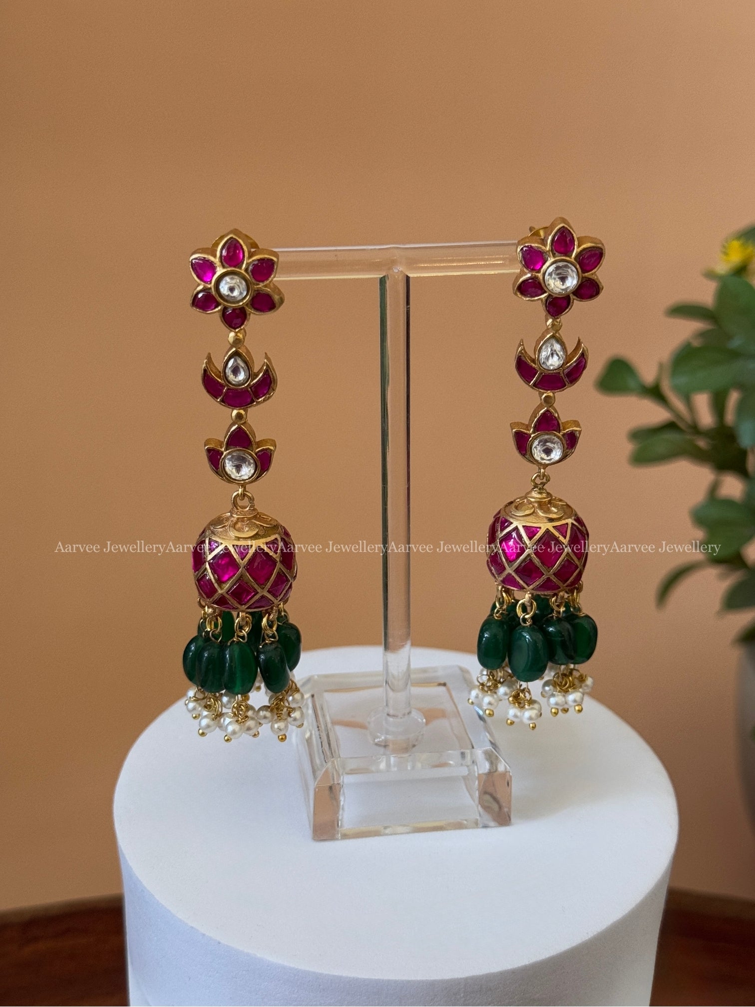 JADAU KUNDAN FLORAL LONG JHUMKI WITH RUBY STONES & GREEN BEADS