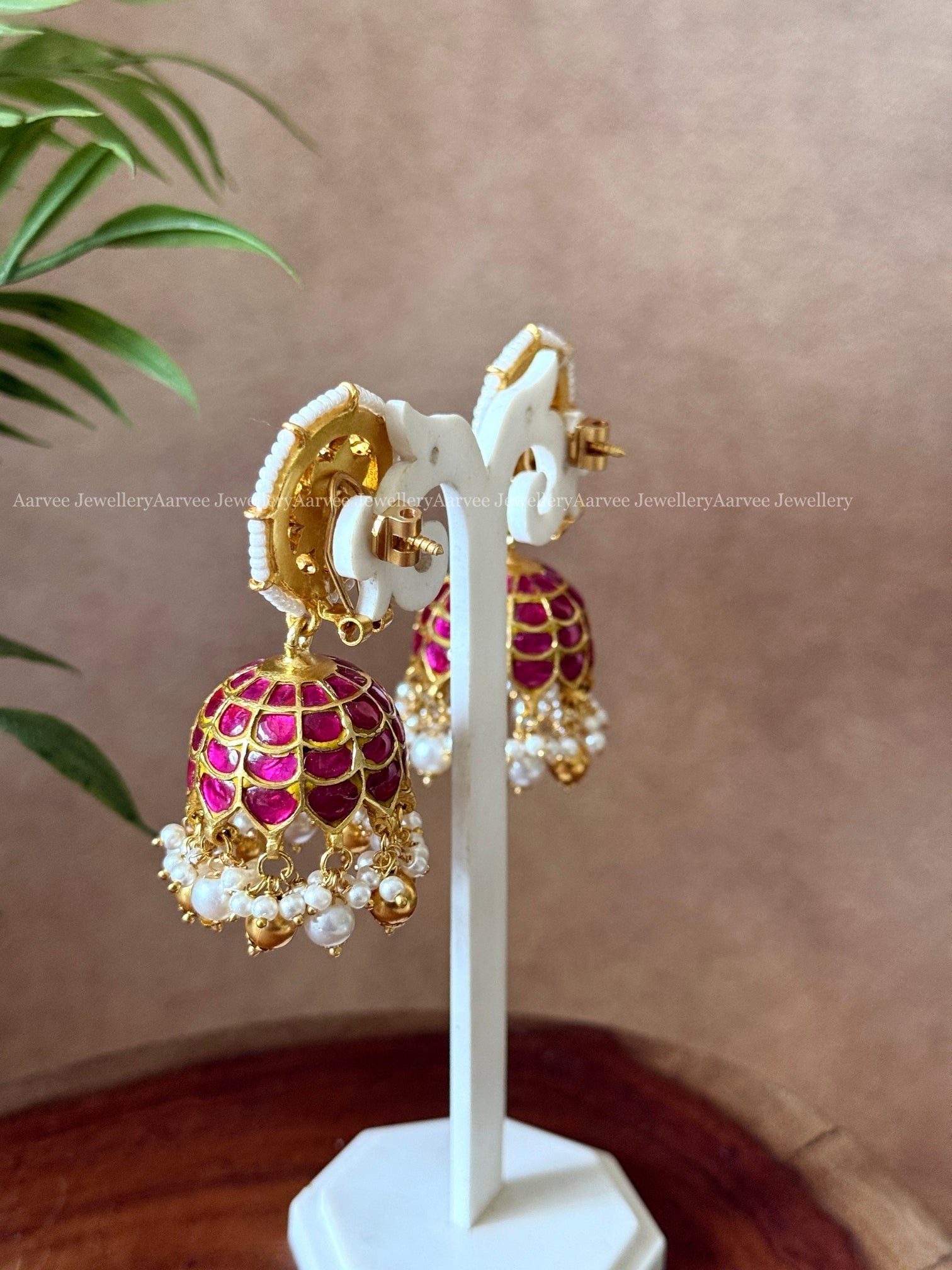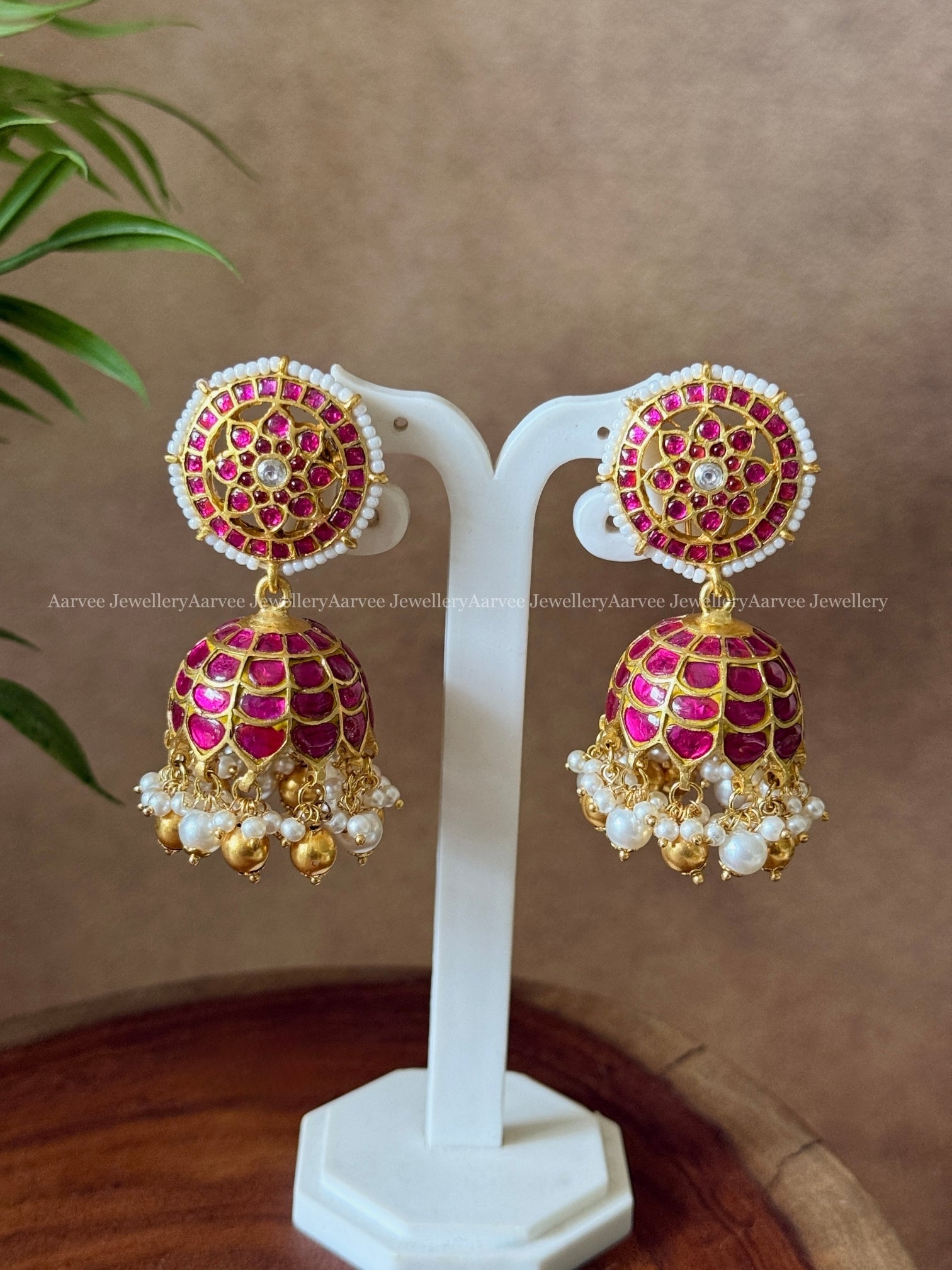 Exquisite Jadau Kundan Butta Jhumkis Featuring Full Ruby Work with Gold and Pearl Bead Detailing