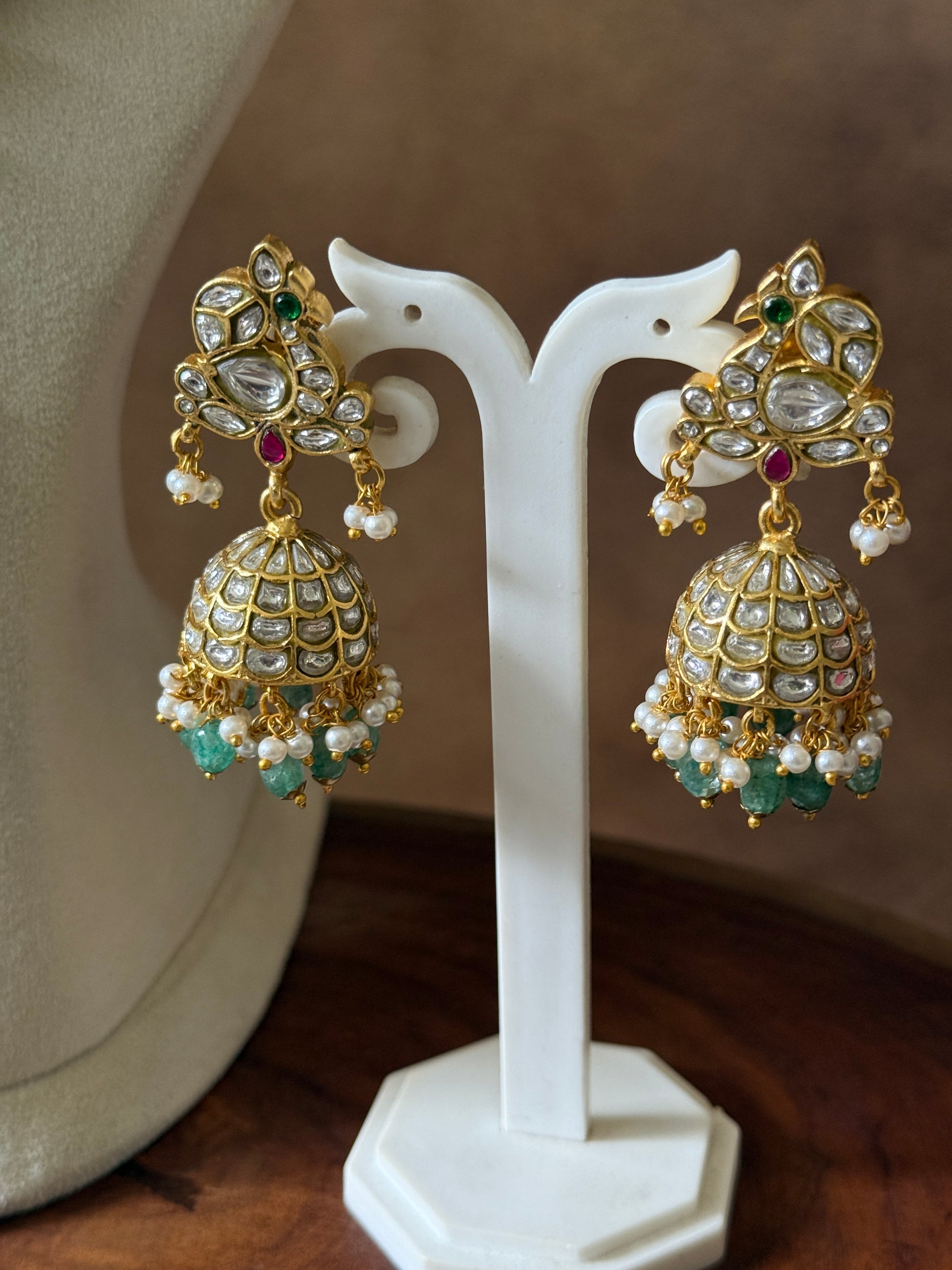 JADAU KUNDAN : FULL WHITE STONES MANGO NECKLACE WITH PEACOK JHUMKI IN PASTEL BEADS