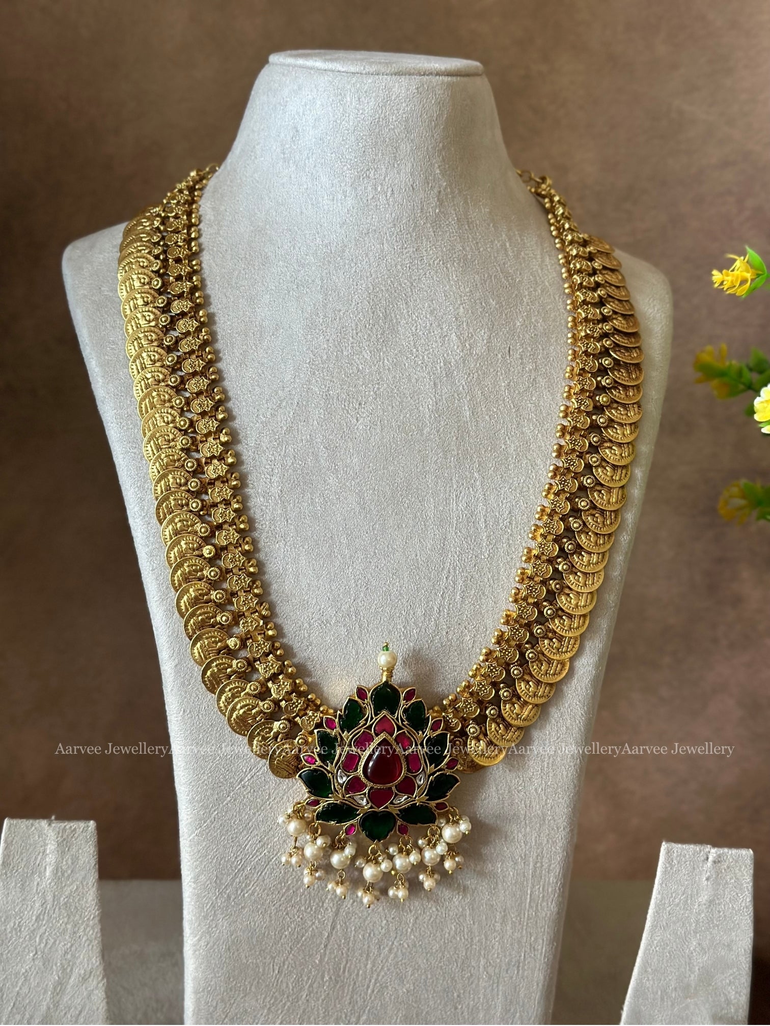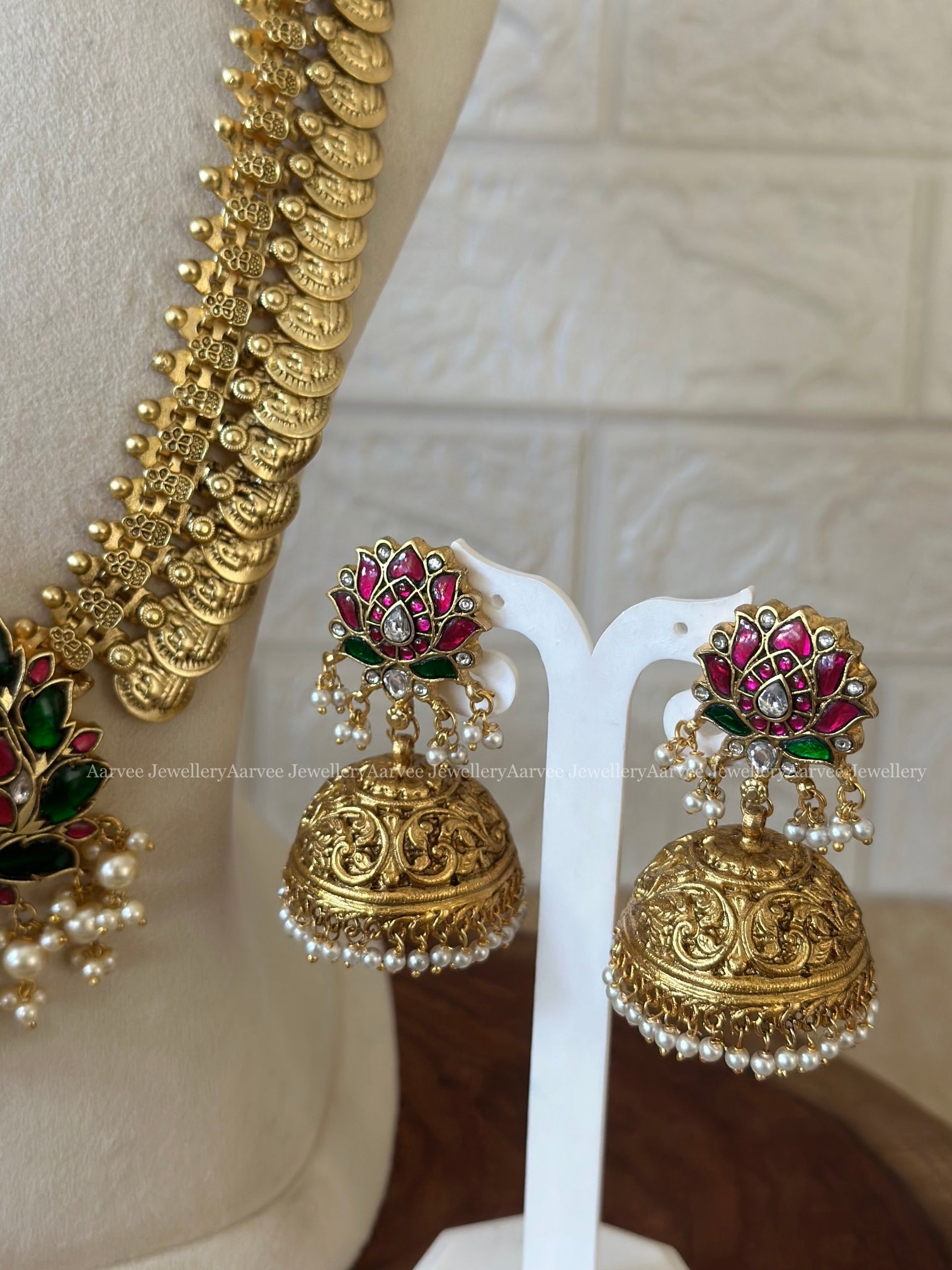 JADAU KUNDAN GOLD COIN MID LENGTH CHAIN WITH LOTUS PENDANT WITH PEARLS AND LOTUS JHUMKI