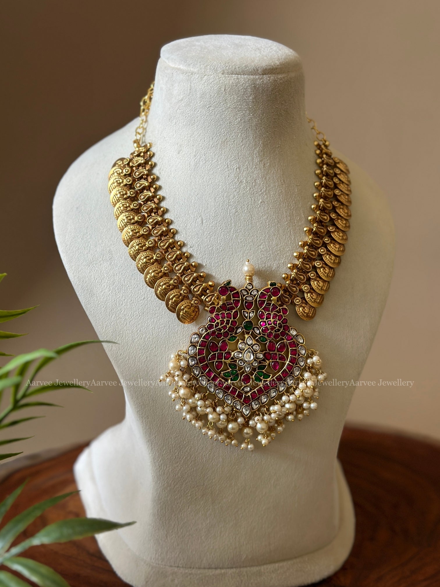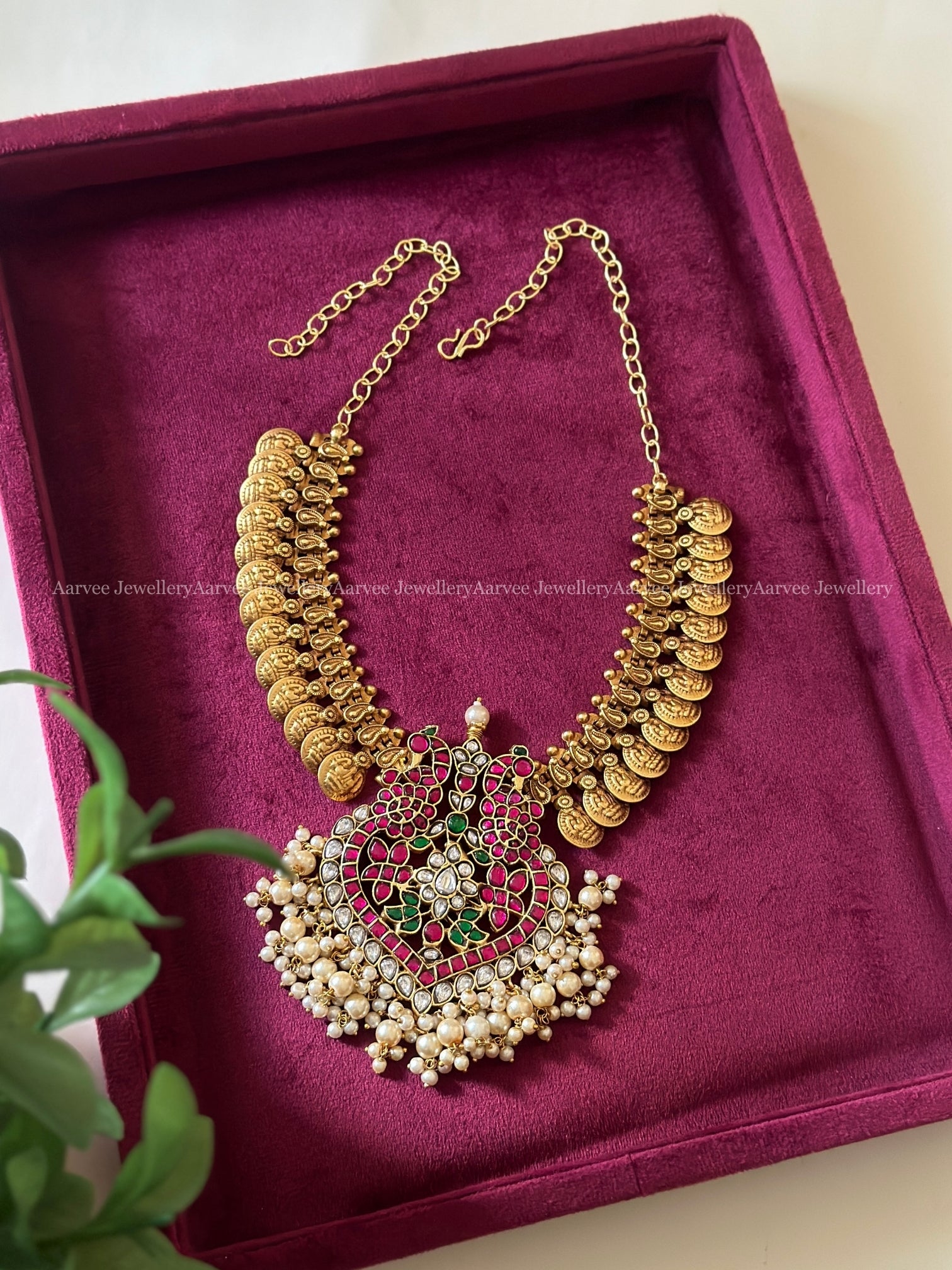Traditional Short Gold Coin Necklace in Jadau Kundan with Peacock Pendant and Pearl Beads