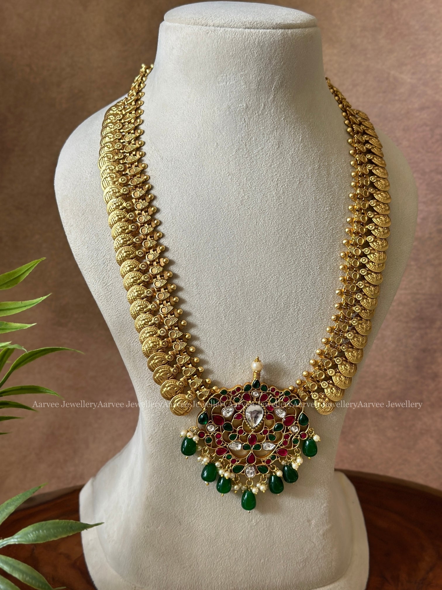 JADAU KUNDAN GOLD FINISH COIN MID-LENGTH CHAIN WITH A FLORAL PENDENT