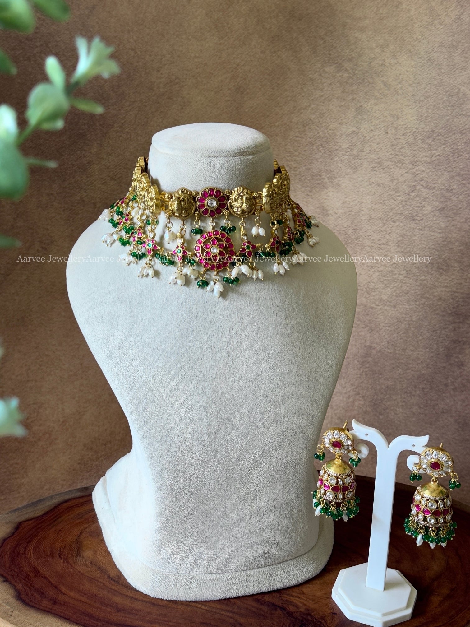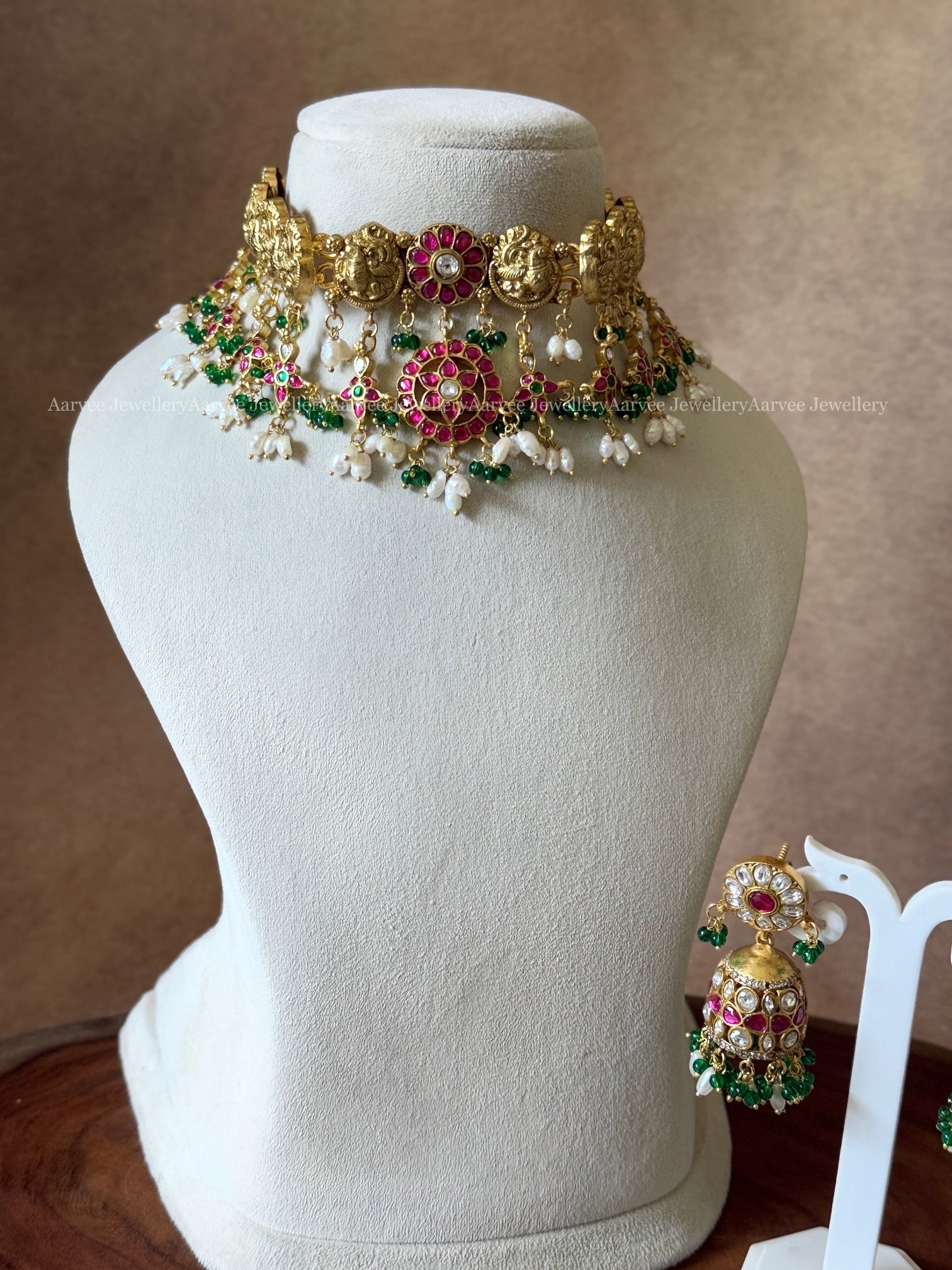 Traditional Gold-Tone Jadau Kundan Annam Choker Set Adorned with Pink Floral Pendant, Rice Pearls & Green Bead Details