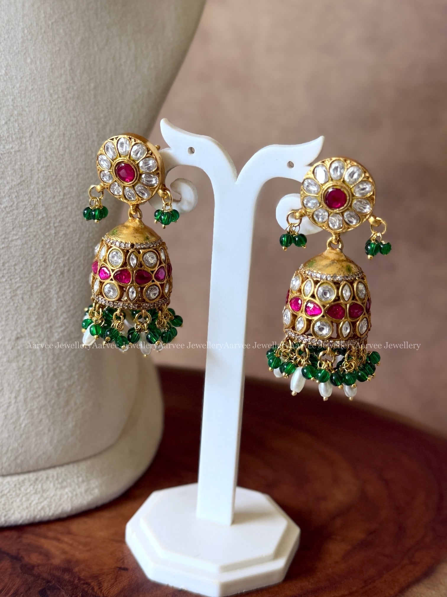 JADAU KUNDAN GOLD TONE ANNAM CHOKER SET WITH PINK FLORAL PENDANT RICE PEARLS & TINY GREEN BEADS