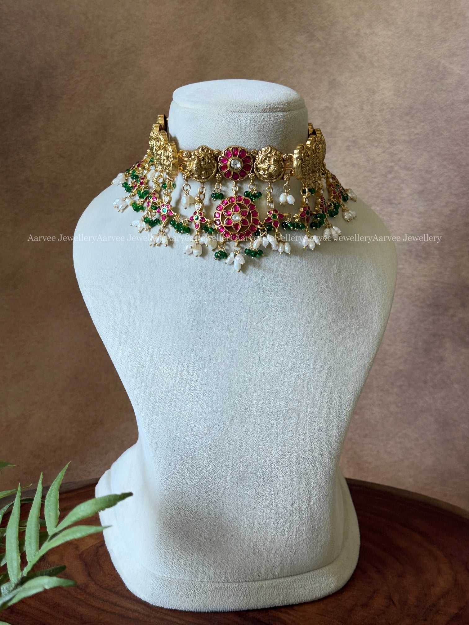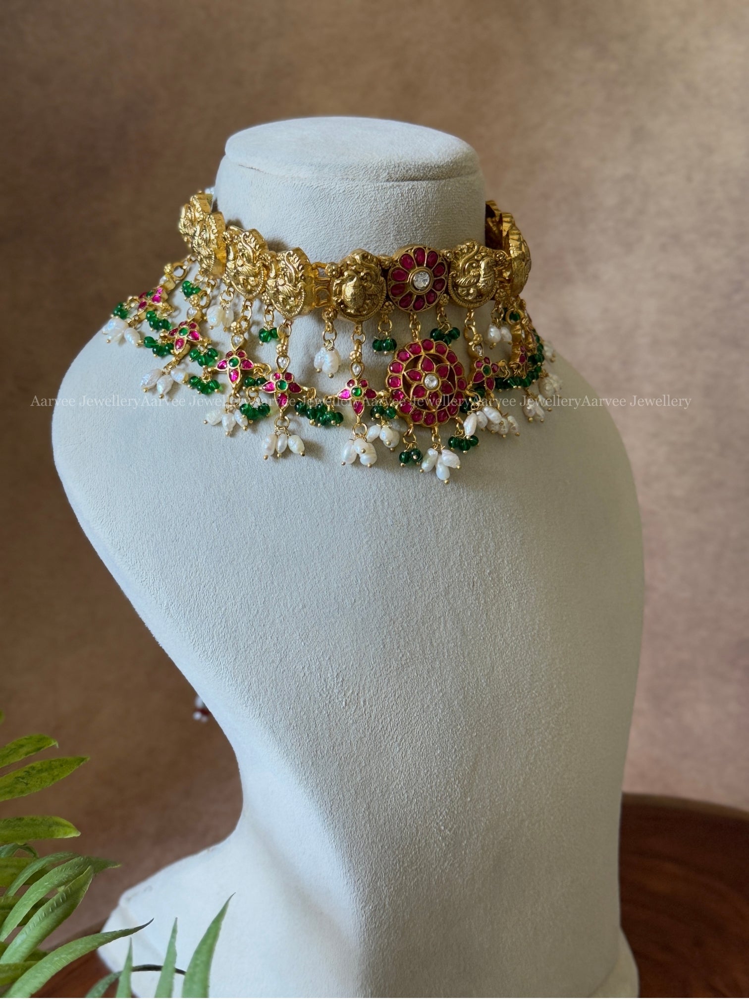 Luxurious Gold-Tone Annam Choker Necklace Embellished with Jadau Kundan Work, Pink Floral Pendant, Rice Pearls & Green Beads