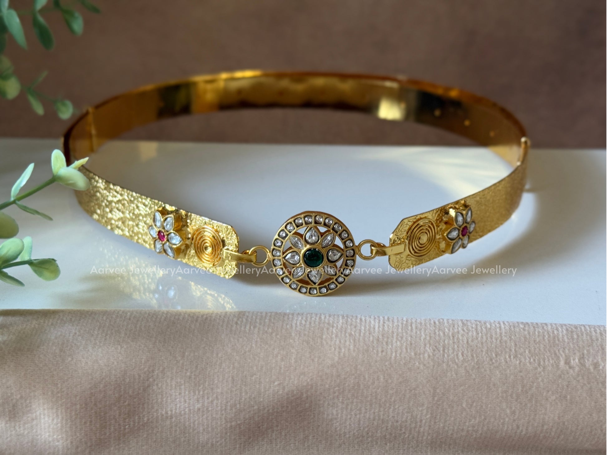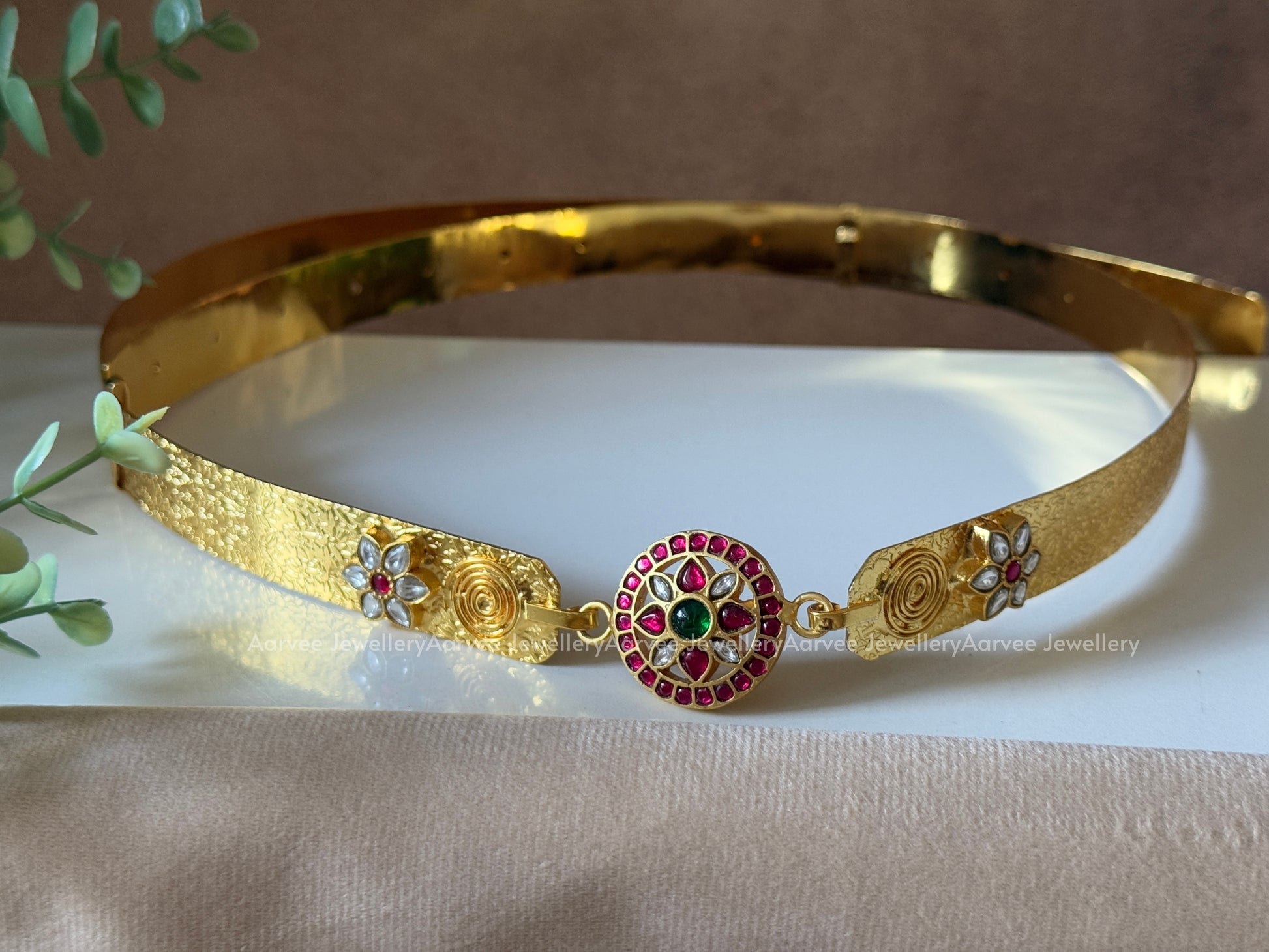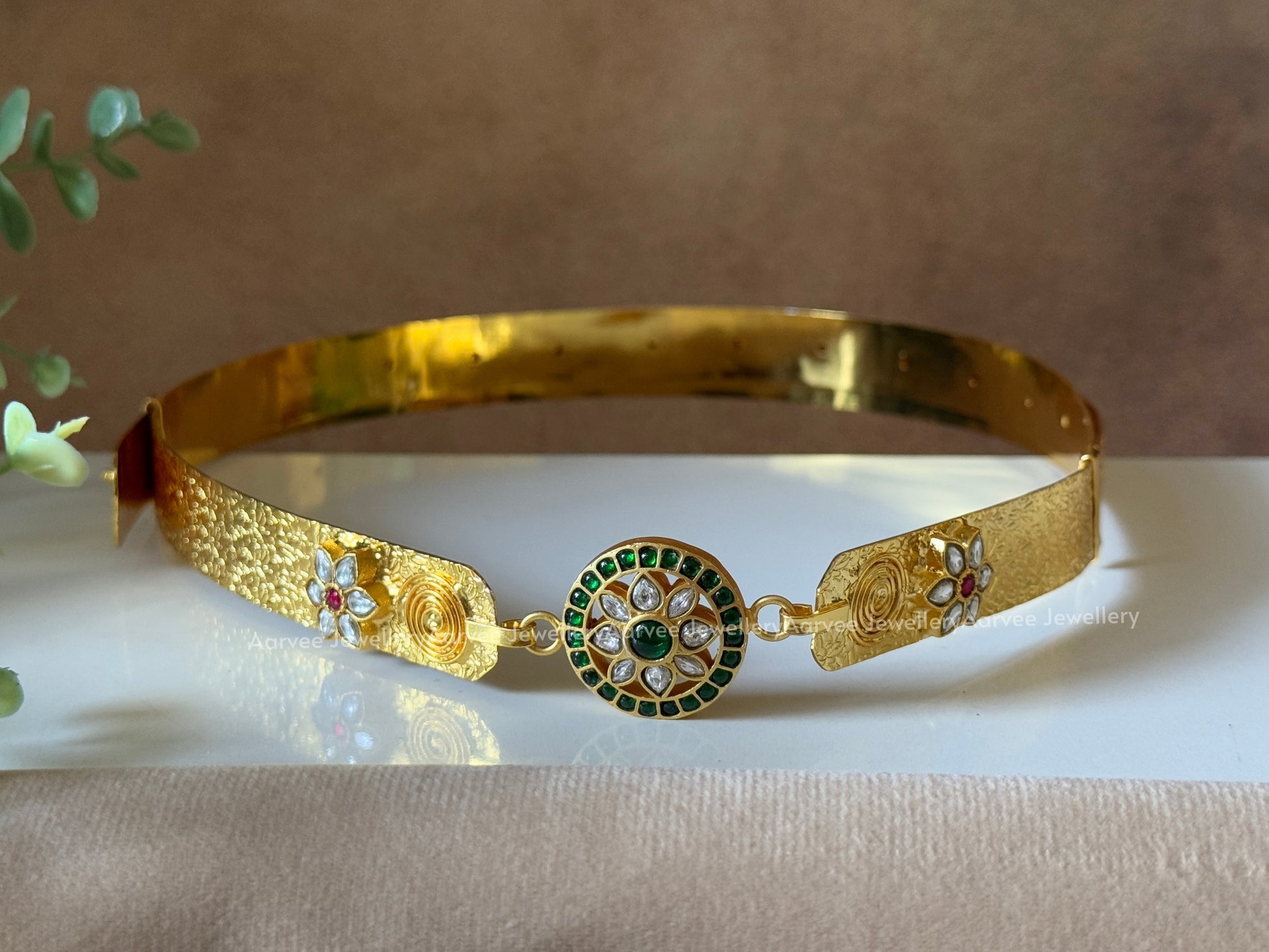 A perfect blend of tradition and elegance, this waist belt features detailed Jadau Kundan work and a central floral pendant in a classic round shape
