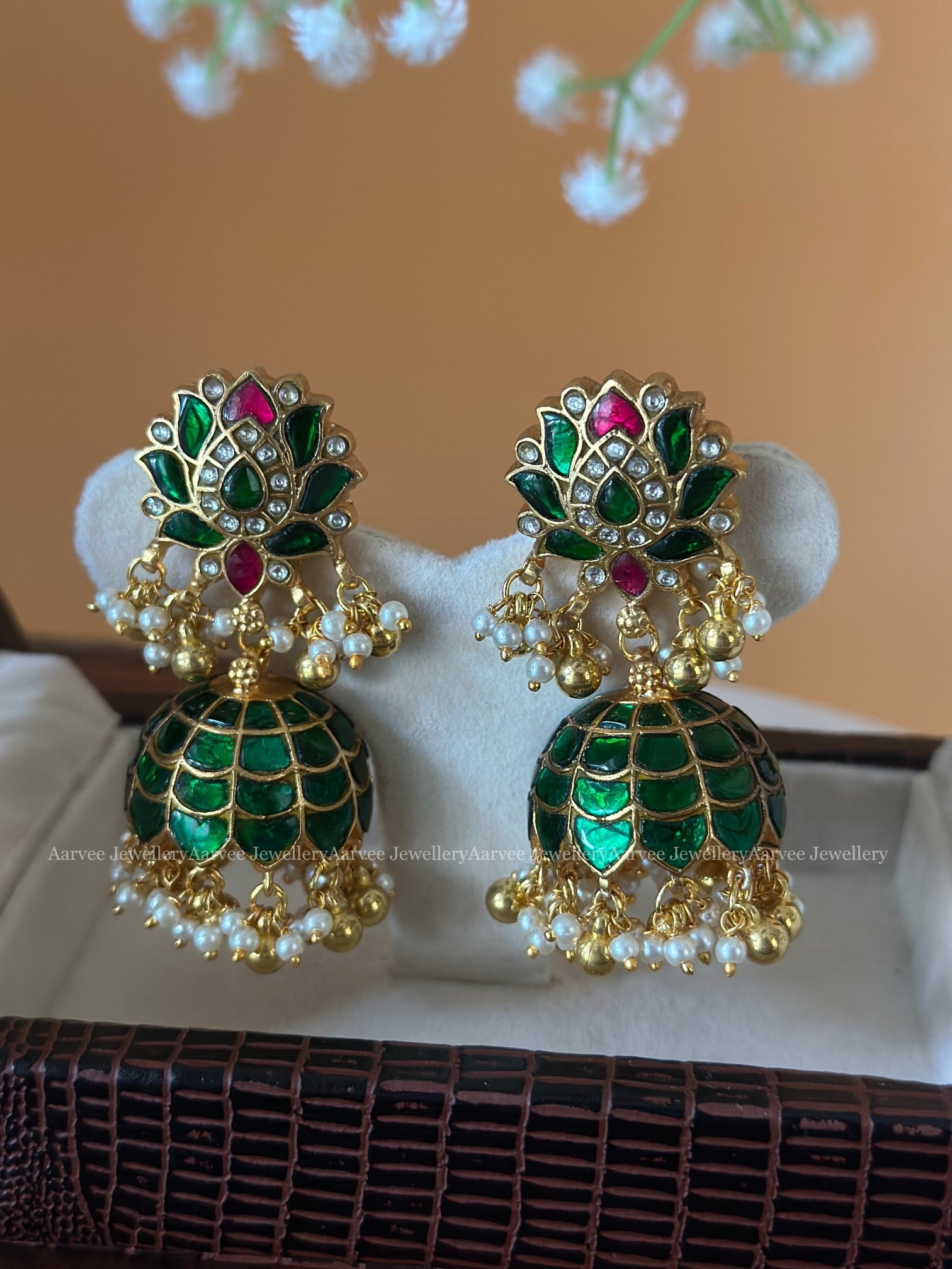 Stunning Jadau Kundan Lotus Jhumki Earrings with Green Gemstones, Gold Details, and Pearls