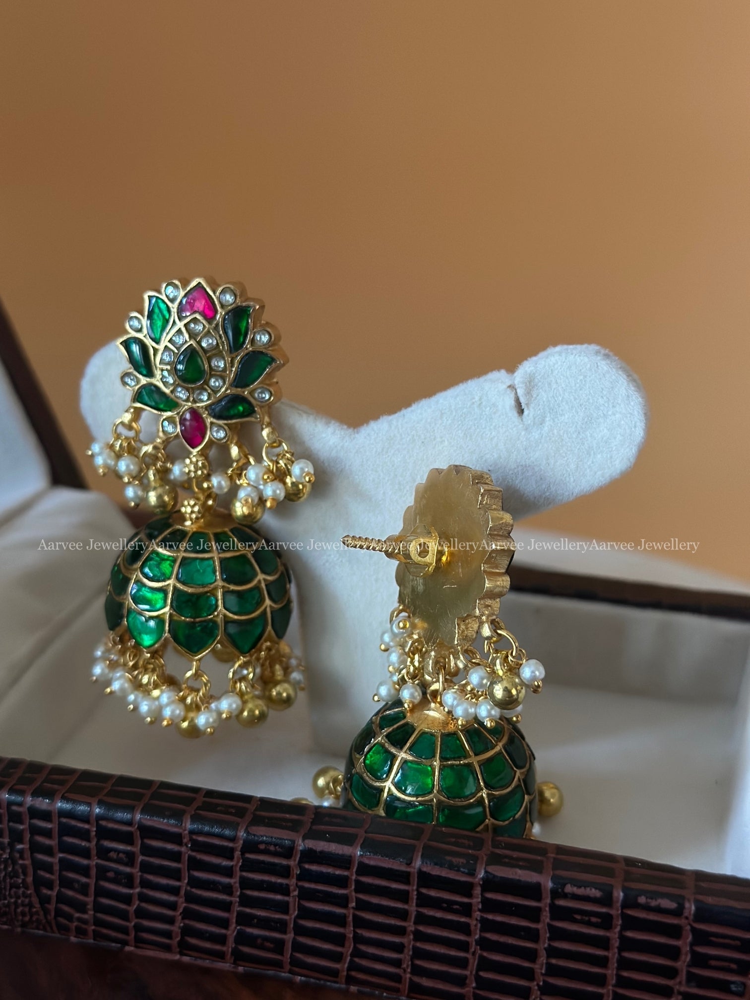 JADAU KUNDAN GREEN STONE LOTUS JHUMKI WITH MIX OF GOLD & PEARLS