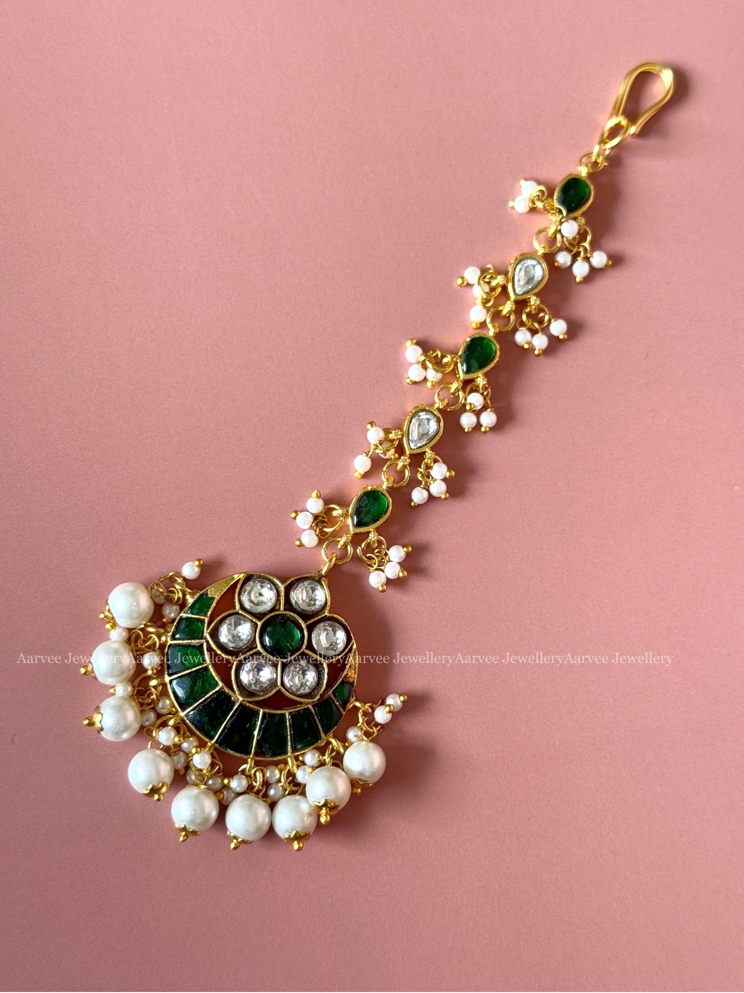 A timeless crescent-shaped maang tikka crafted in intricate jadau kundan, embellished with green and white stones and finished with elegant pearl hangings