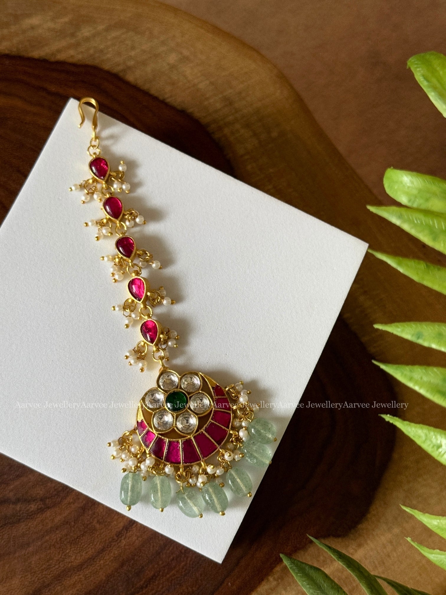JADAU KUNDAN HALF MOON DESIGN TIKKA WITH RUBY STONES AND PASTEL BEADS