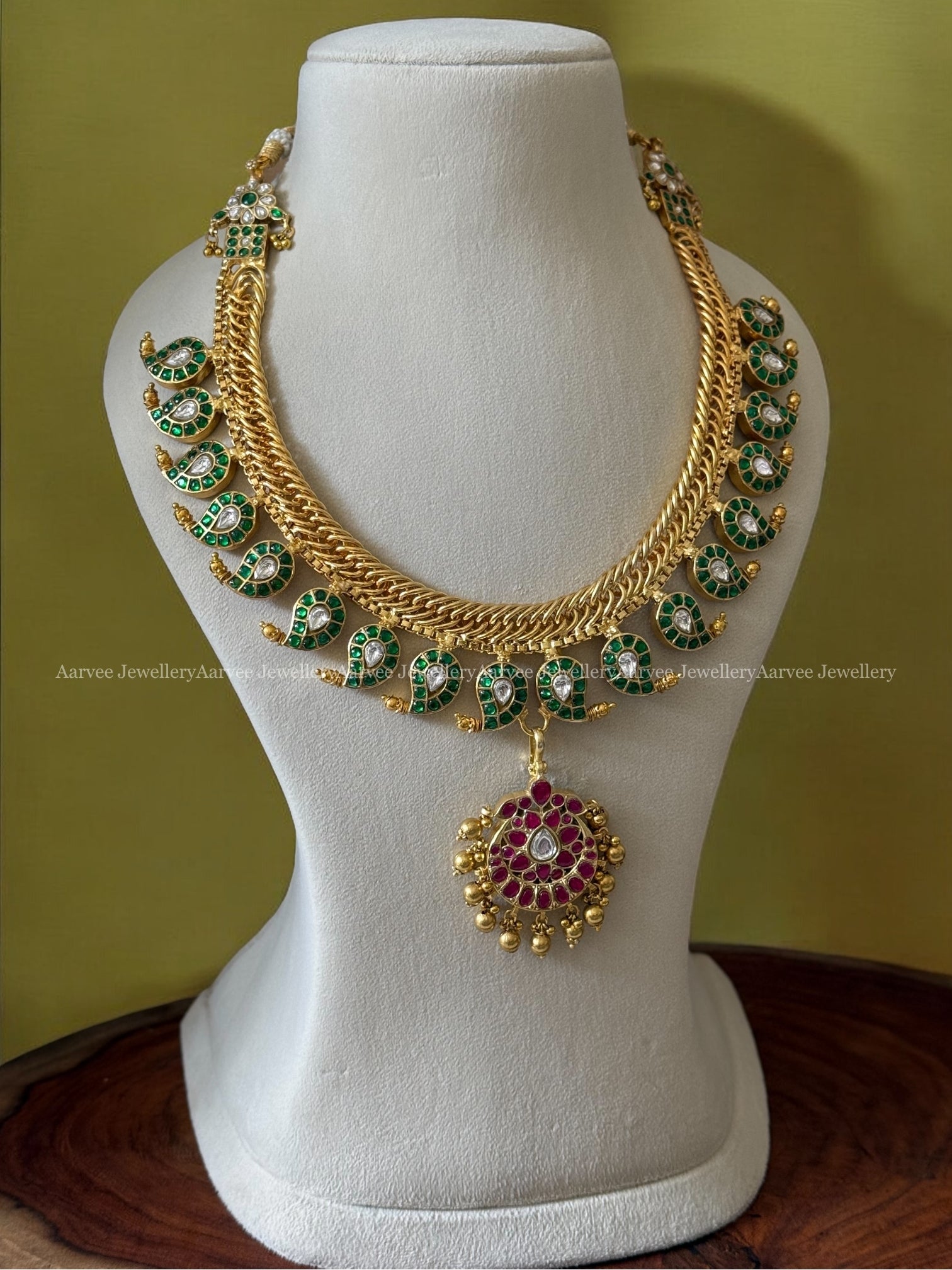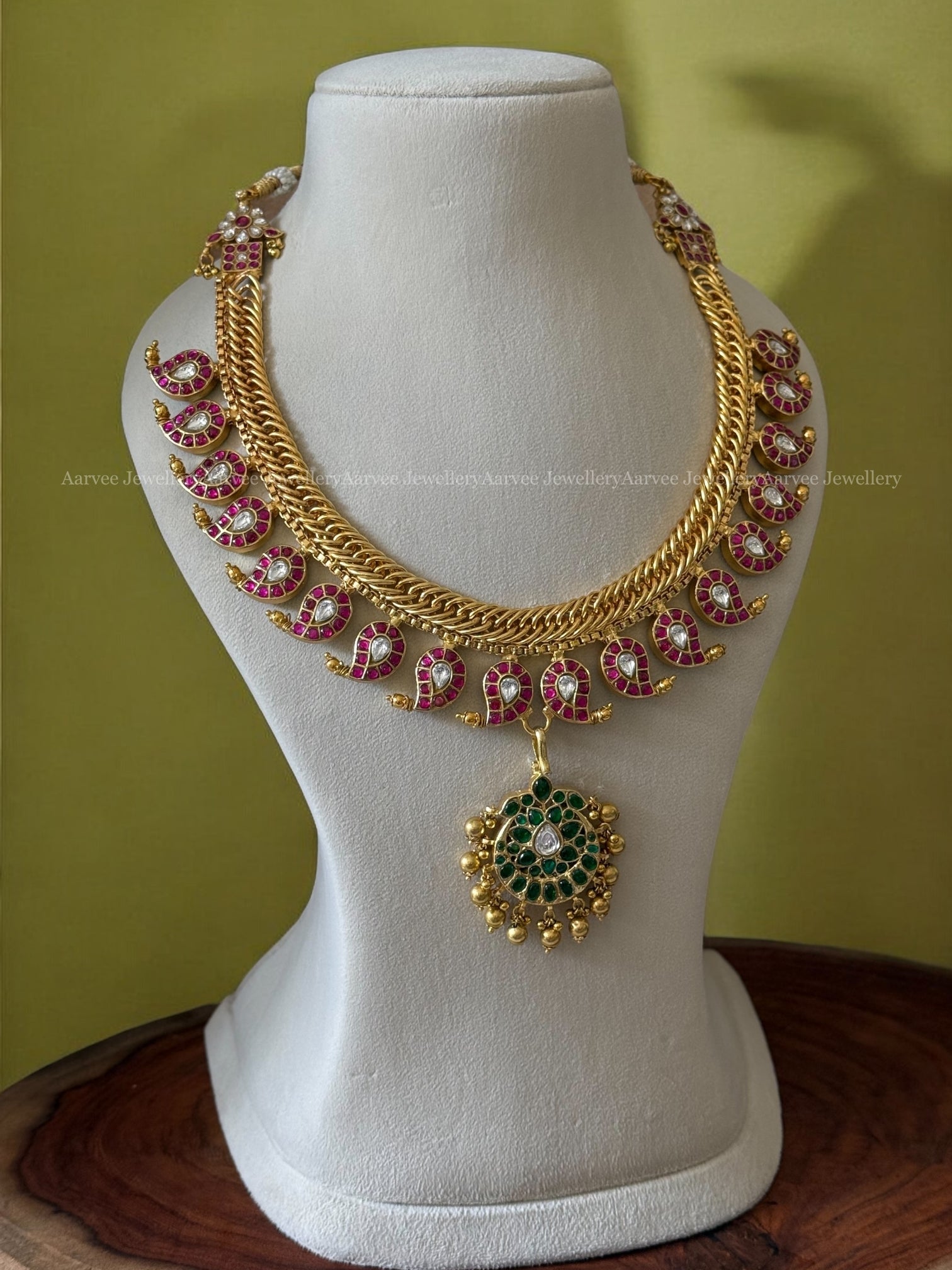 Versatile Jadau Kundan Jalebi Reversible 6-in-1 Necklace Featuring Pink and Green Stones with a Detachable Pendant