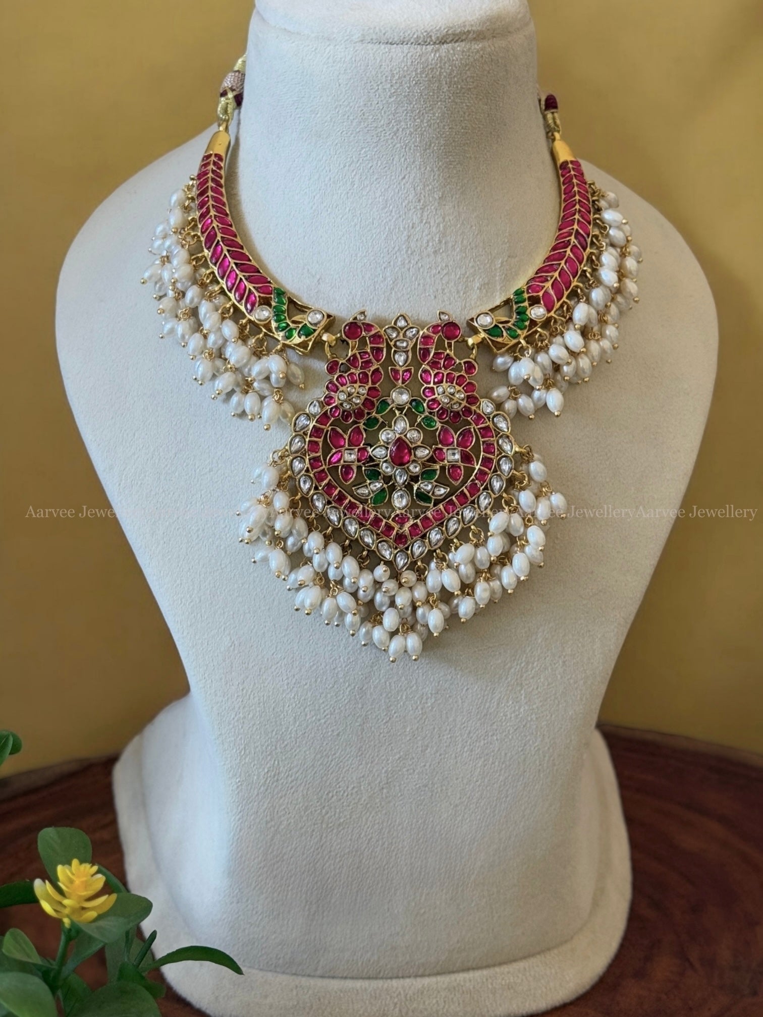 JADAU KUNDAN KANTI NECKLACE WITH PEACOCK PENDANT AND RICE PEARLS