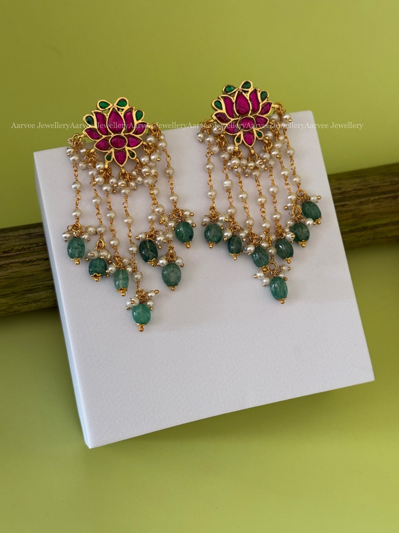 JADAU KUNDAN LOTUS DANGLER EARRINGS WITH LAYERED PASTEL BEAD DROPS