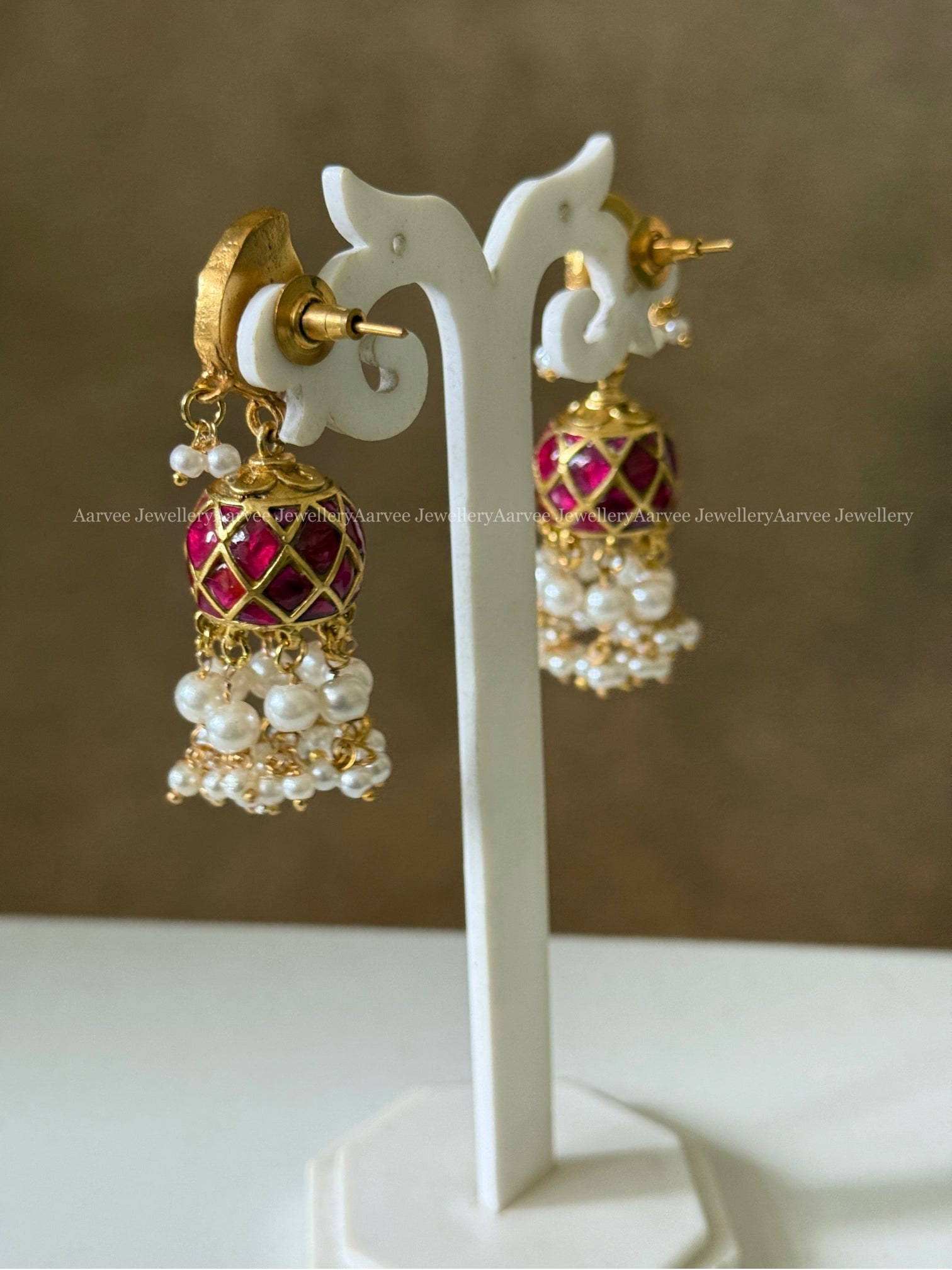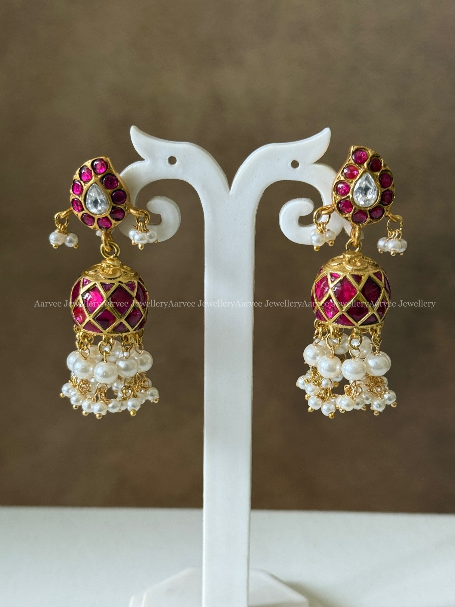 JADAU KUNDAN MANGO JHUMKI WITH PINK STONE & PEARLS