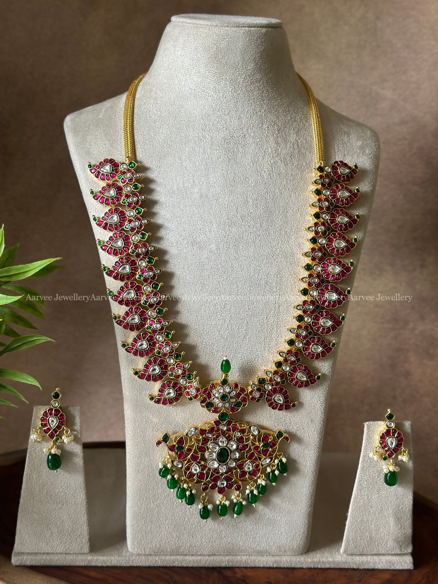 JADAU KUNDAN MANGO MOTIF MID LENGTH HARAM SET WITH RUBY STONES & GREEN BEADS