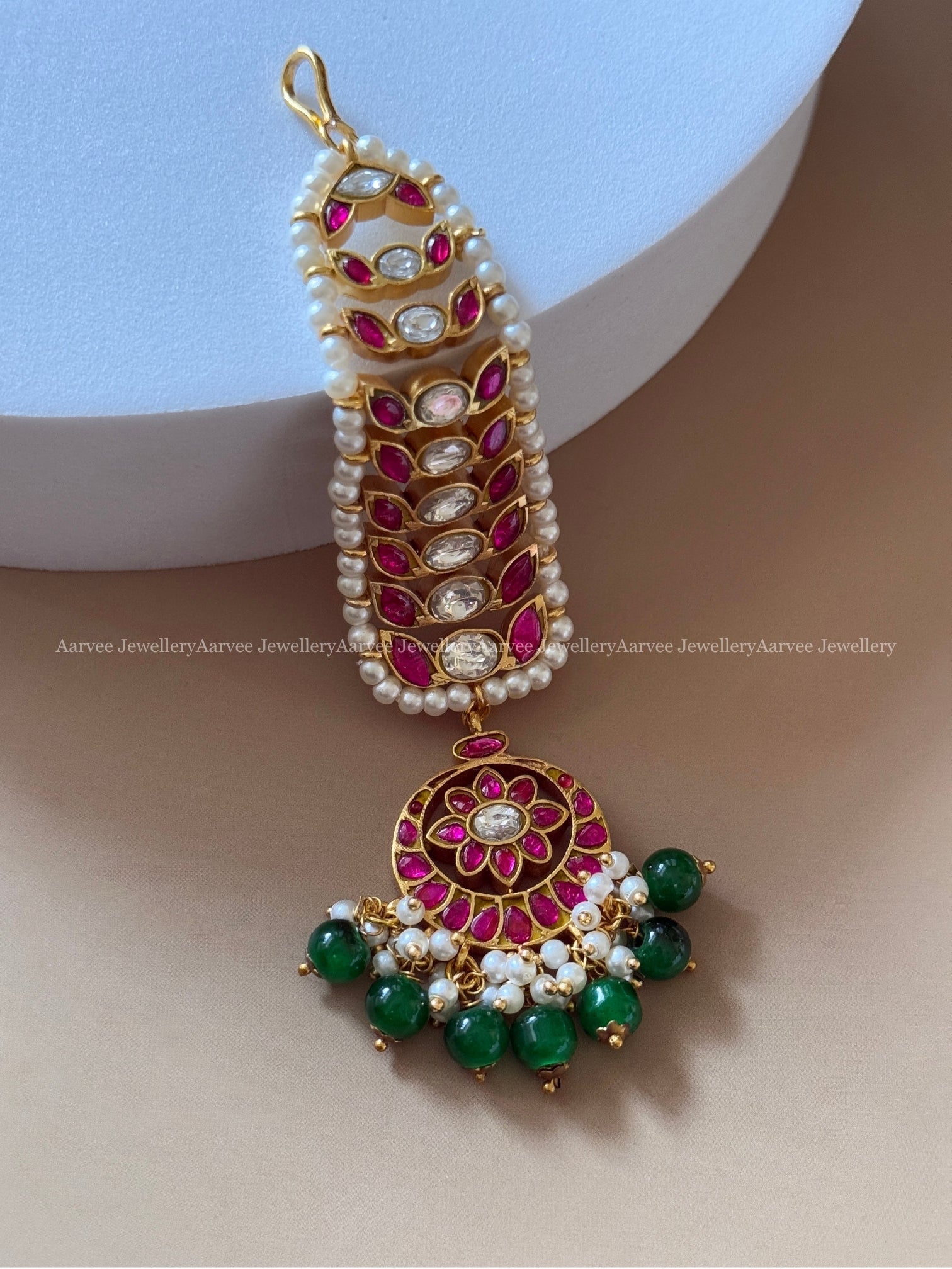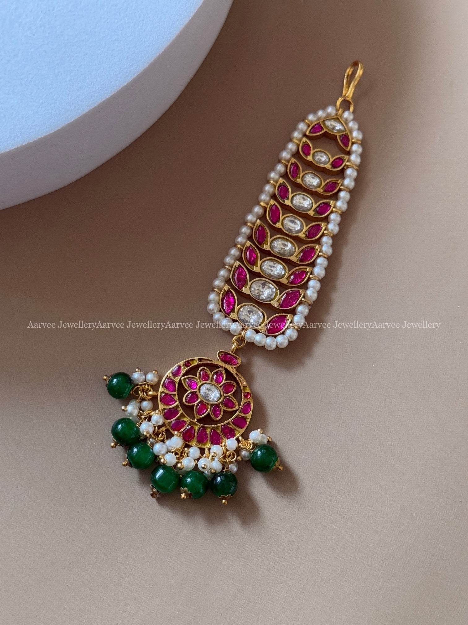 Regal Jadau Kundan Forehead Ornament embellished with Pink and Green Detailing