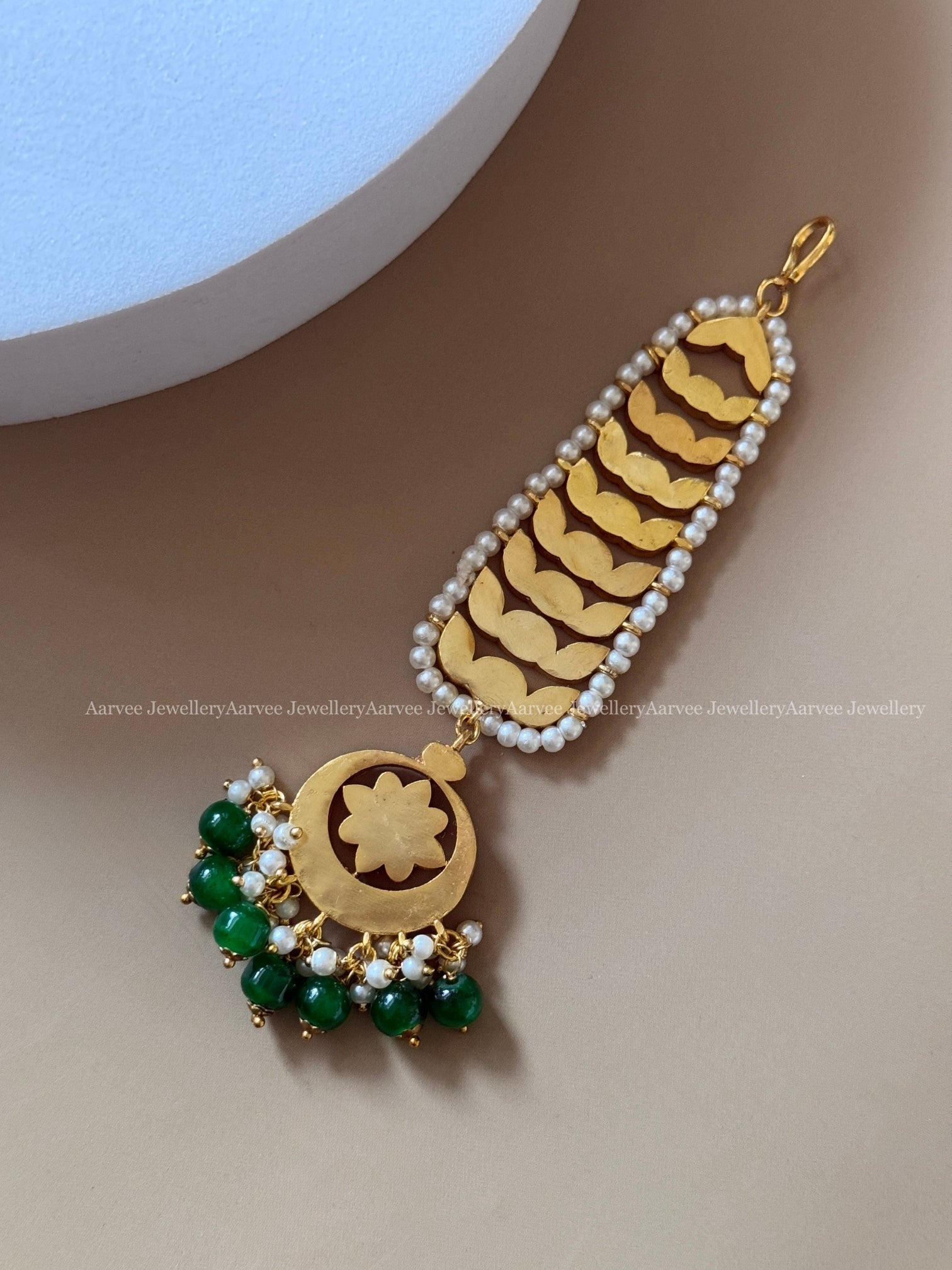 JADAU KUNDAN MANGTIKKA WITH PINK STONES & GREEN BEADS