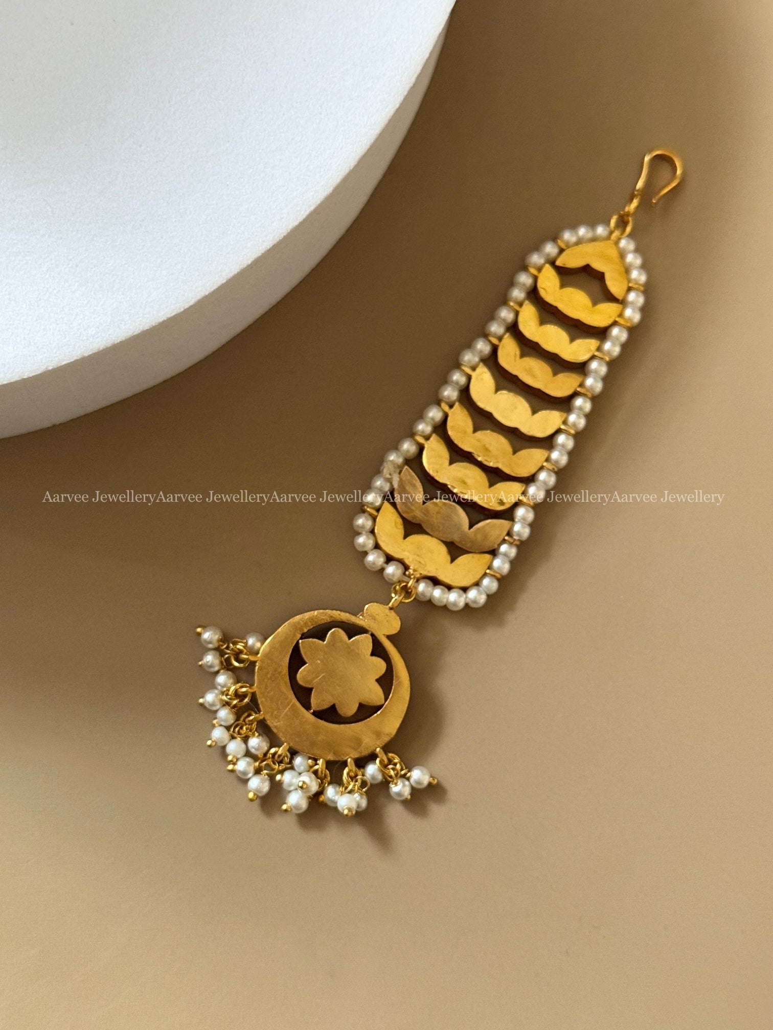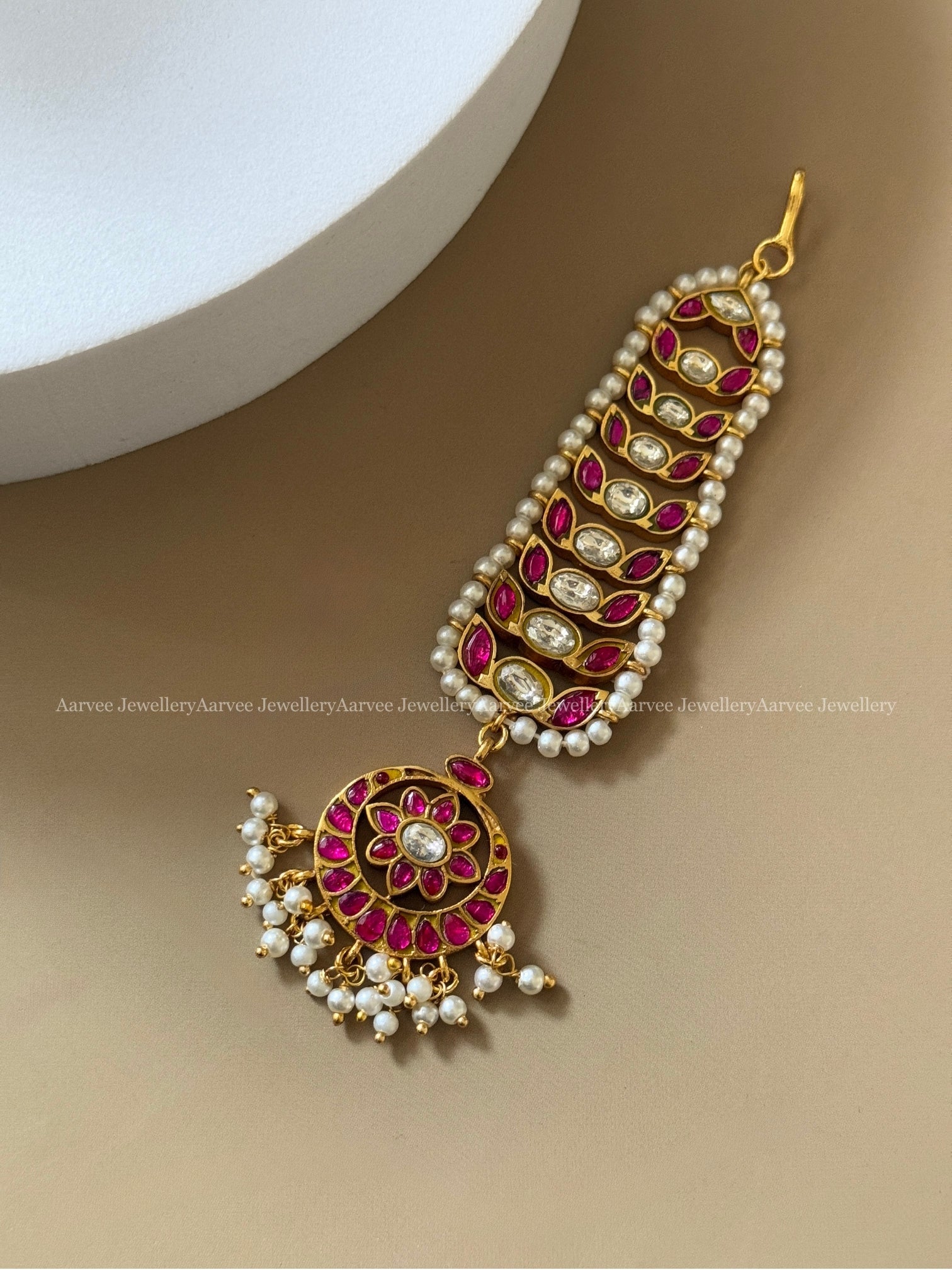 Elegant Jadau Kundan Maang Tikka adorned with Pink Stones and Classic Pearls