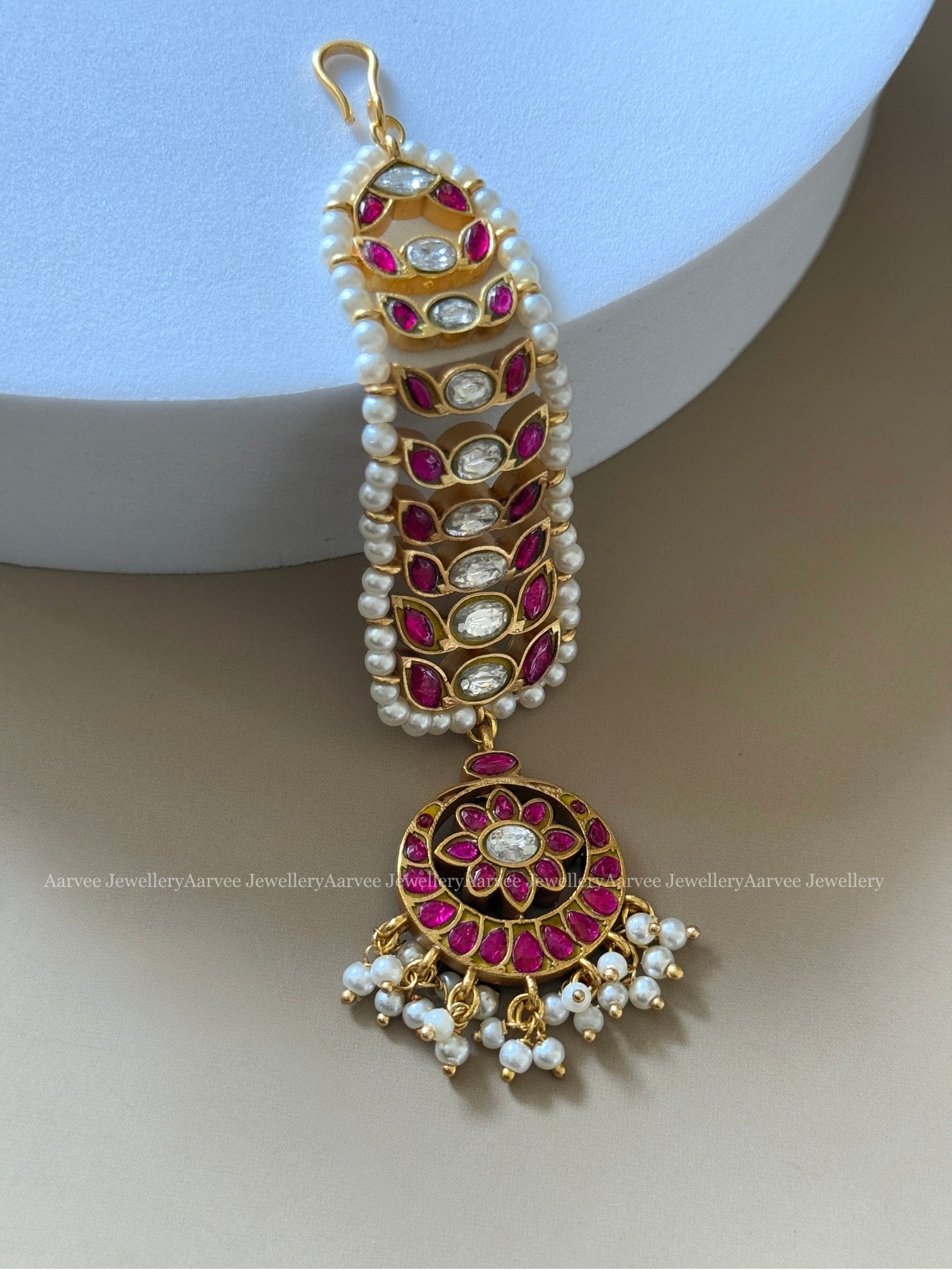 JADAU KUNDAN MANGTIKKA WITH PINK STONES & PEARLS